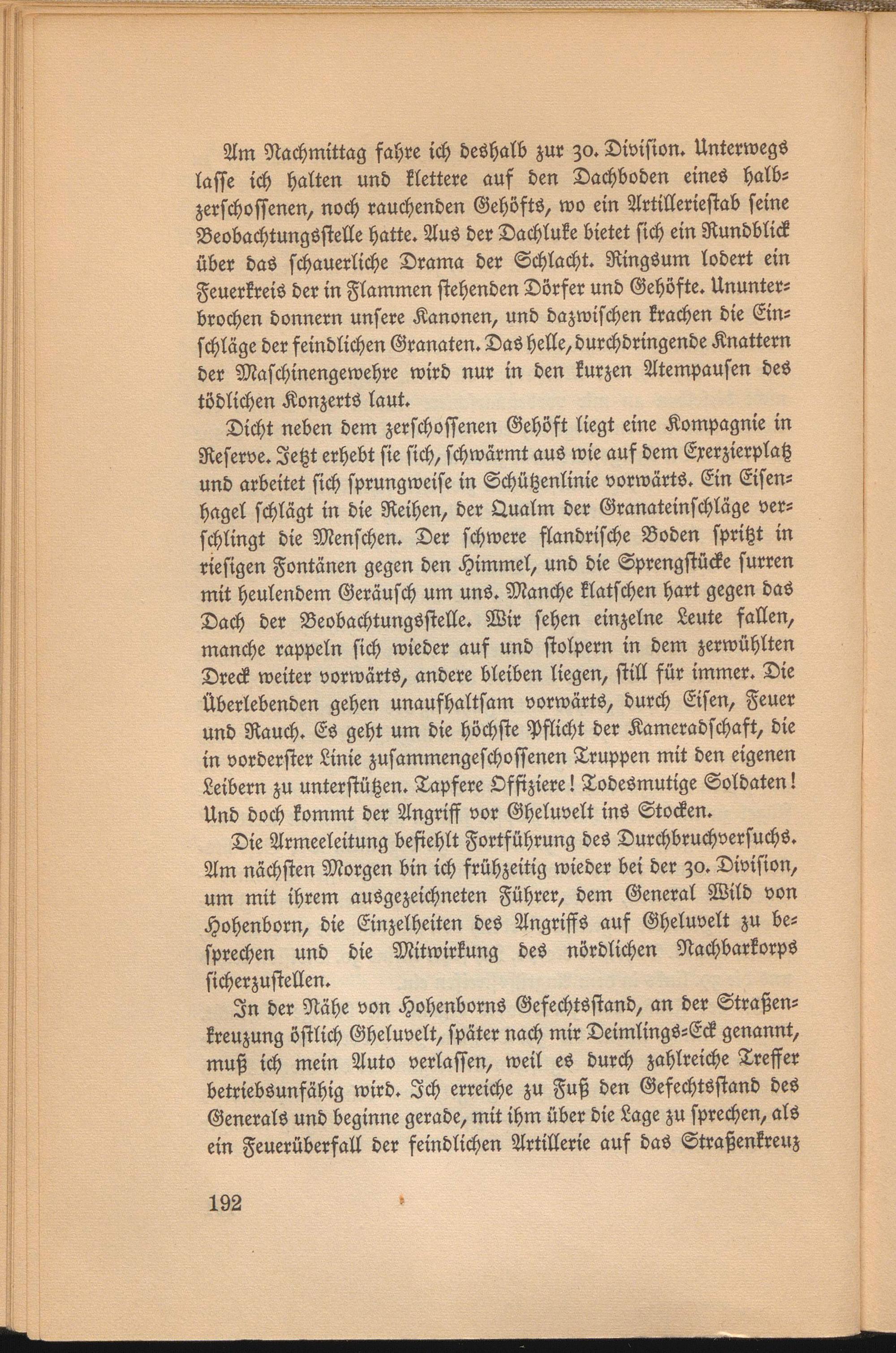 Dicht neben dem zerschossenen Gehöft liegt eine Kompagnie in Reserve. Jetzt erhebt sie sich, schwärmt aus wie auf dem Exerzierplatz und arbeitet sich sprungweise in Schützenlinie vorwärts. Ein Eisenhagel schlägt in die Reihen, der Qualm der Granateinschläge verschlingt die Menschen. Der schwere flandrische Boden spritzt in riesigen Fontänen gegen den Himmel, und die Sprengstücke surren mit heulendem Geräusch um uns. Manche klatschen hart gegen das Dach der Beobachtungsstelle. Wir sehen einzelne Leute fallen, manche rappeln sich wieder aus und stolpern in dem zerwühlten Dreck weiter vorwärts, andere bleiben liegen, still für immer. Die Überlebenden gehen unaufhaltsam vorwärts, durch Eisen, Feuer und Rauch. Es geht um die höchste Pflicht der Kameradschaft, die in vorderster Linie zusammengeschossenen Truppen mit den eigenen Leibern zu unterstützen. Tapfere Offiziere! Todesmutige Soldaten! Und doch kommt der Angriff vor Gheluvelt inS Stocken.