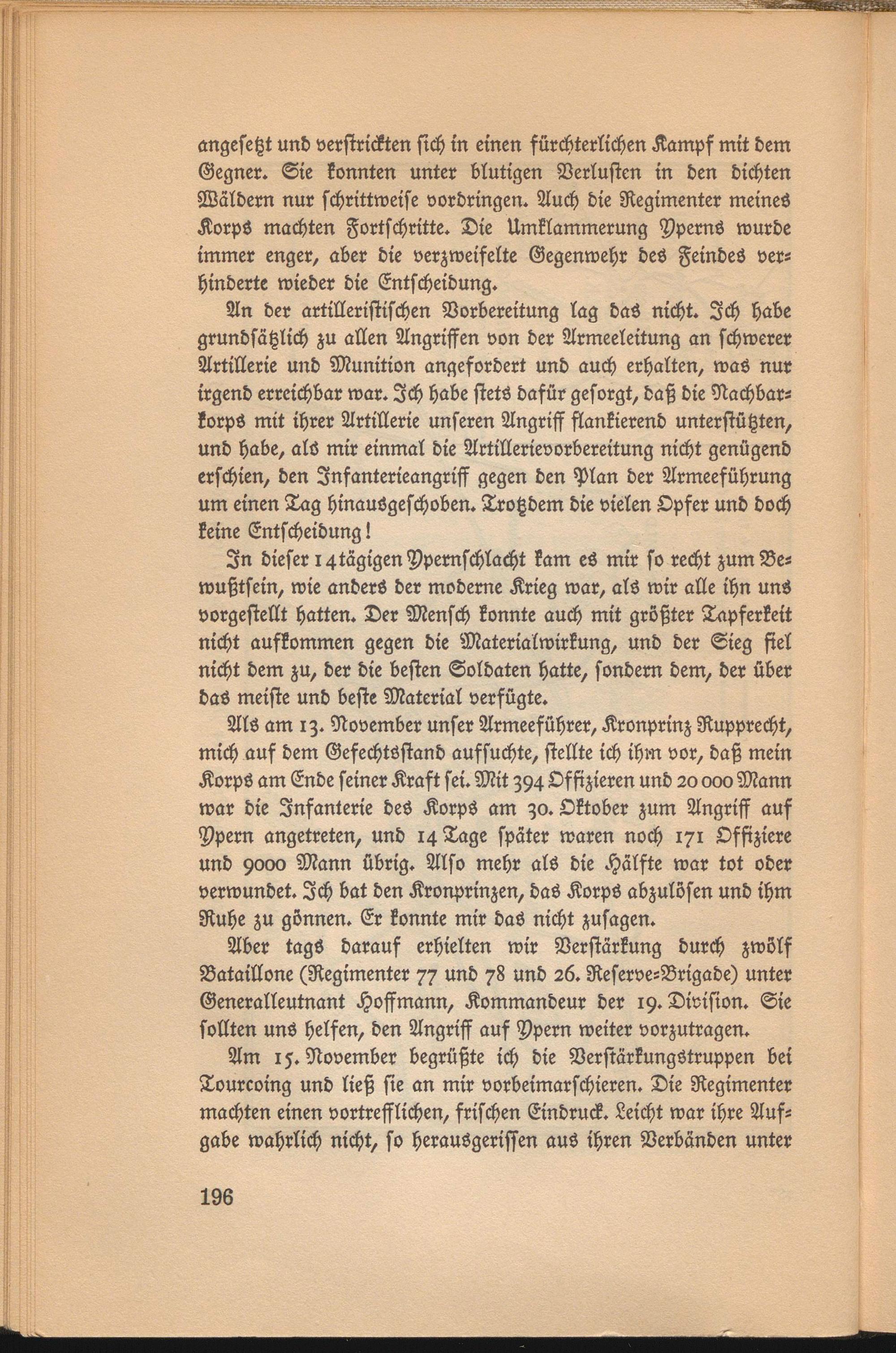 Als am i z. November unser Armeeführer, Kronprinz Rupprecht, mich auf dem Gefechtsstand aufsuchte, stellte ich ihm vor, daß mein KorpS am Ende seiner Kraft sei. Mit Z94 Offizieren und 20 000 Mann war die Infanterie deS Korps am go. Oktober zum Angriff auf Vpern angetreten, und 14 Tage später waren noch 171 Offiziere und 9000 Mann übrig. Also mehr als die Hälfte war tot oder verwundet. Ich bat den Kronprinzen, das Korps abzulösen und ihm Ruhe zu gönnen. Er konnte mir das nicht zusagen.