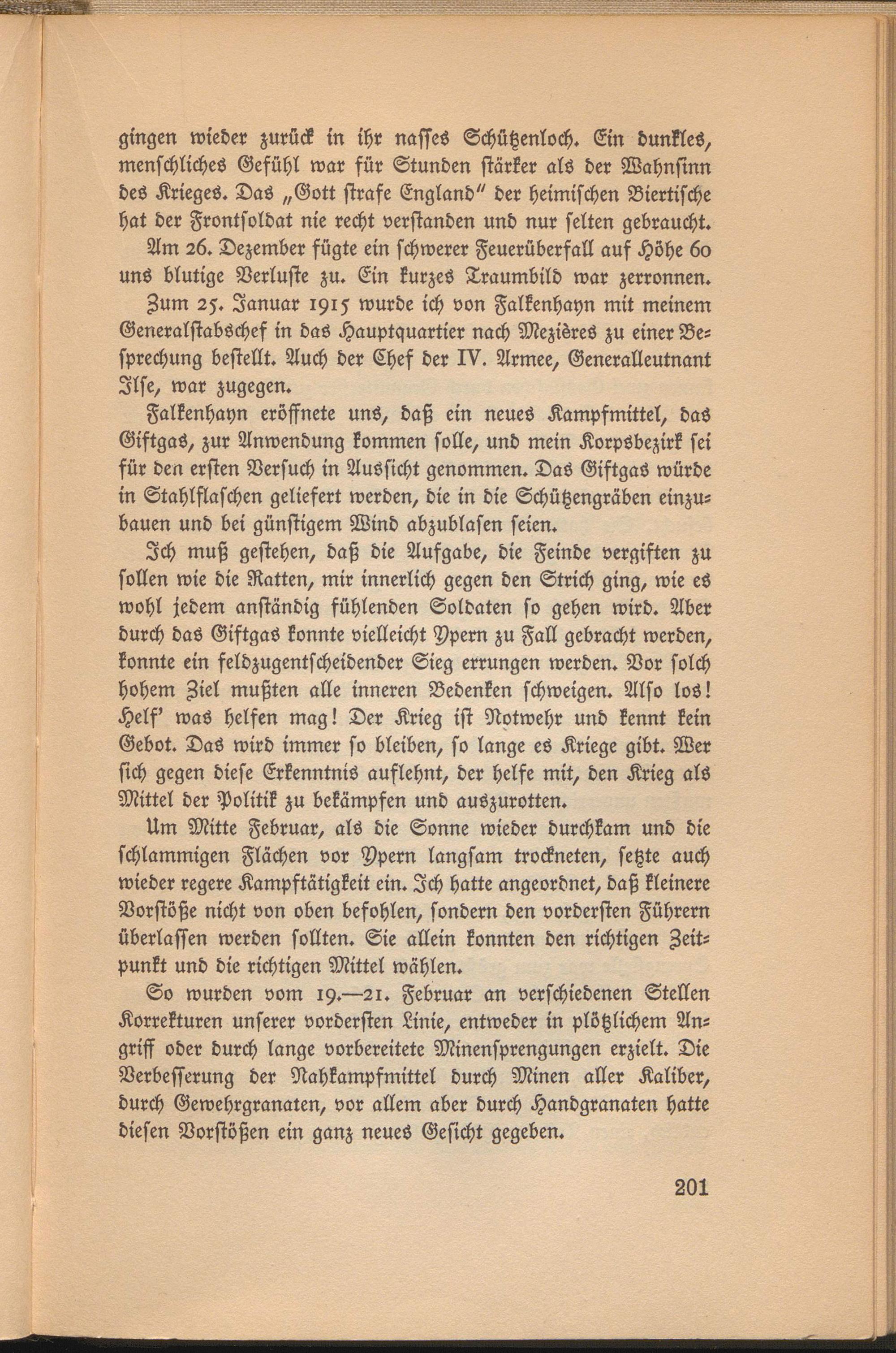 Ich muß gestehen, daß die Aufgabe, die Feinde vergiften zu sollen wie die Ratten, mir innerlich gegen den Strich ging, wie es wohl jedem anständig fühlenden Soldaten so gehen wird. Aber durch das Giftgas konnte vielleicht Vpern zu Fall gebracht werden, konnte ein feldzugentscheidender Sieg errungen werden. Vor solch hohem Ziel mußten alle inneren Bedenken schweigen. Also los! Helf' was helfen mag! Der Krieg ist Notwehr und kennt kein Gebot. Das wird immer so bleiben, so lange es Kriege gibt. Wer sich gegen diese Erkenntnis auflehnt, der helfe mit, den Krieg als Mittel der Politik zu bekämpfen und auszurotten.