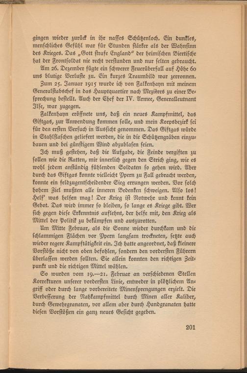 Falkenhayn eröffnete uns, daß ein neues Kampfmittel, das Giftgas, zur Anwendung kommen solle, und mein Korpsbezirk sei für den ersten Versuch in Aussicht genommen. Das Giftgas würde in Stahlflaschen geliefert werden, die in die Schützengräben einzubauen und bei günstigem Wind abzublasen seien.