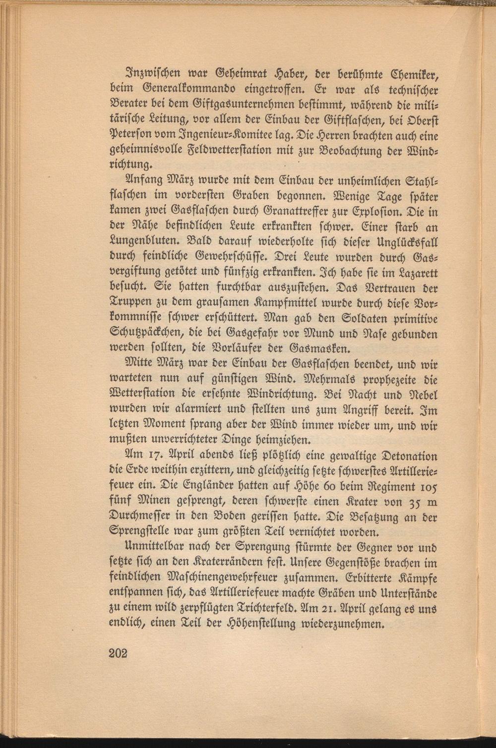 Anfang März wurde mit dem Einbau der unheimlichen Stahlflaschen im vordersten Graben begonnen. Wenige Tage später kamen zwei Gasflaschen durch Granattreffer zur Explosion. Die in der Nähe befindlichen Leute erkrankten schwer. Einer starb an Lungenbluten. Bald darauf wiederholte sich dieser Unglücksfall durch feindliche Gewehrschüsse. Drei Leute wurden durch Gasvergiftung getötet und fünfzig erkrankten. Ich habe sie im Lazarett besucht. Sie hatten furchtbar auszustehen. Das Vertrauen der Truppen zu dem grausamen Kampfmittel wurde durch diese Vorkommnisse schwer erschüttert. Man gab den Soldaten primitive Schutzpäckchen, die bei Gasgefahr vor Mund und Nase gebunden werden sollten, die Vorläufer der Gasmasken.