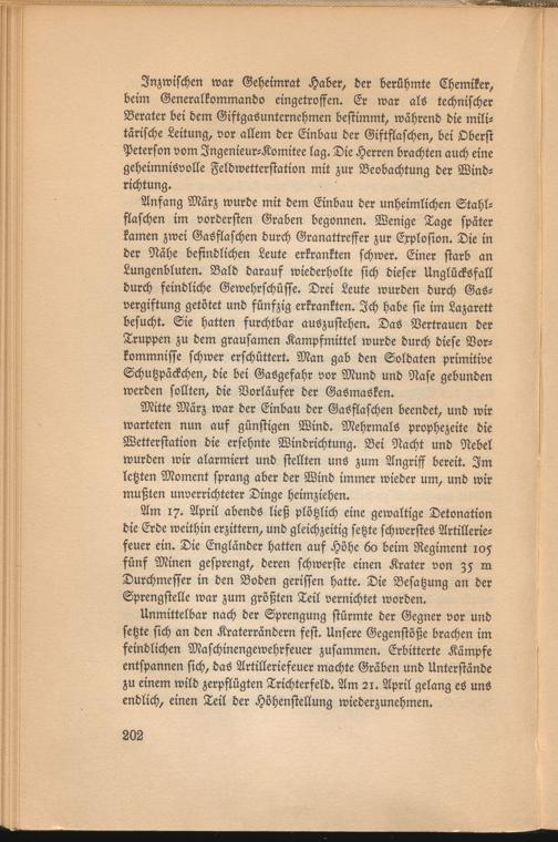 Inzwischen war Geheimrat Haber, der berühmte Chemiker, beim Generalkommando eingetroffen. Er war als technischer Berater bei dem Giftgasuntemehmen bestimmt, während die militärische Leitung, vor allem der Einbau der Giftflaschen, bei Oberst Peterson vom Ingenieur-Komitee lag. Die Herren brachten auch eine geheimnisvolle Feldwetterstation mit zur Beobachtung der Windrichtung.