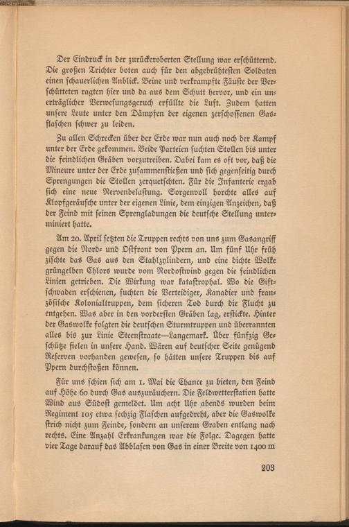 Am 20. April setzten die Truppen rechts von uns zum Gasangriff gegen die Nord- und Ostfront von Ppern an. Um fünf Uhr früh zischte das Gas aus den Stahlzylindern, und eine dichte Wolke grüngelben Chlors wurde vom Nordostwind gegen die feindlichen Linien getrieben. Die Wirkung war katastrophal. Wo die Giftschwaden erschienen, suchten die Verteidiger, Kanadier und französische Kolonialtruppen, dem sicheren Tod durch die Flucht zu entgehen. Was aber in den vordersten Gräben lag, erstickte. Hinter der Gaswolke folgten die deutschen Sturmtruppen und überrannten alles bis zur Linie Steenstraate—Langemark. Über fünfzig Geschütze fielen in unsere Hand. Wären auf deutscher Seite genügend Reserven vorhanden gewesen, so hätten unsere Truppen bis auf Vpem durchstoßen können.