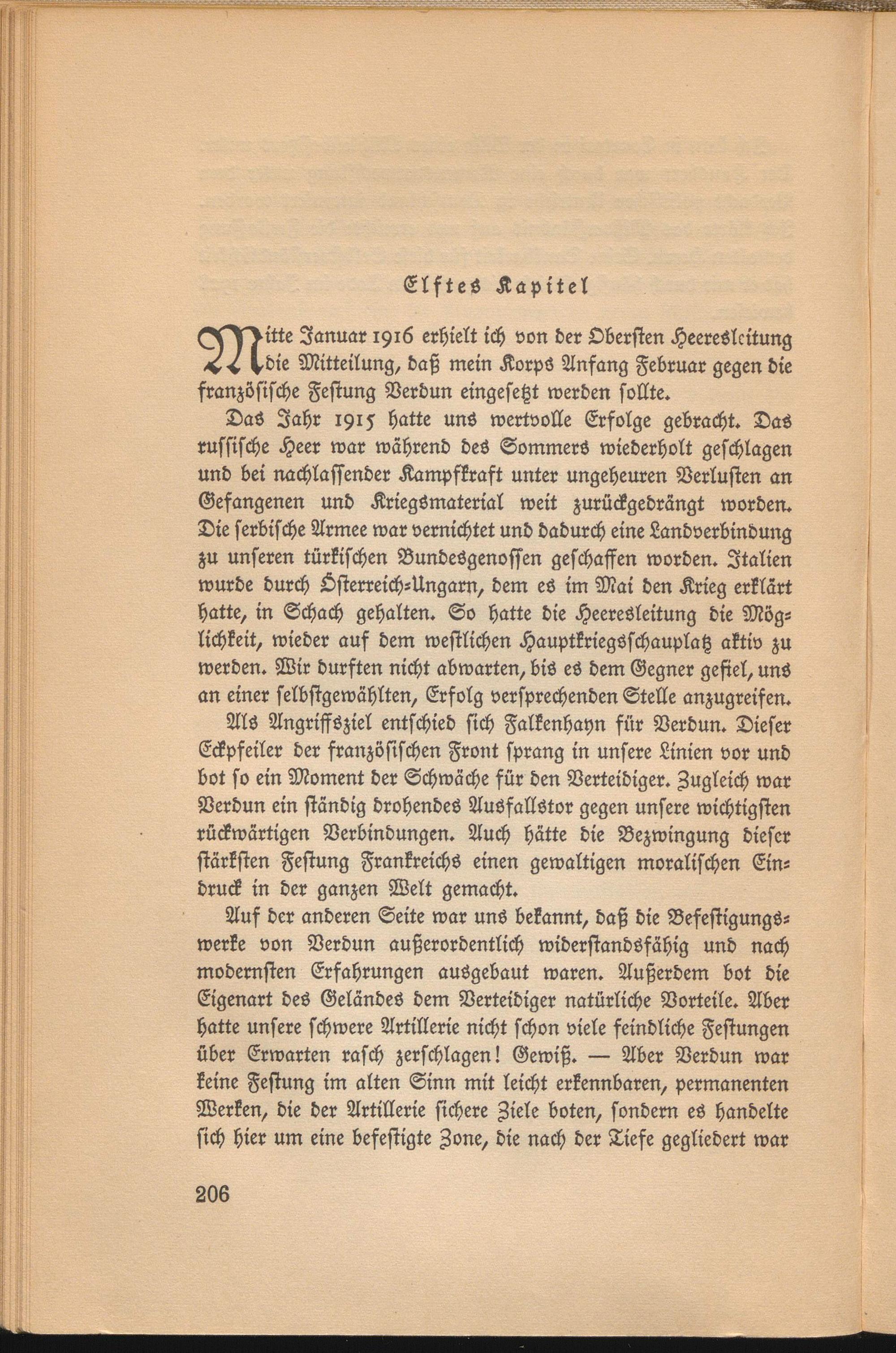 DaS Jahr 1915 hatte unS wertvolle Erfolge gebracht. DaS russische Heer war während des Sommers wiederholt geschlagen und bei nachlassender Kampfkraft unter ungeheuren Verlusten an Gefangenen und Kriegsmaterial weit zurückgedrängt worden. Die serbische Armee war vernichtet und dadurch eine Landverbindung zu unseren türkischen Bundesgenossen geschaffen worden. Italien wurde durch Osterreich-Ungarn, dem es im Mai den Krieg erklärt hatte, in Schach gehalten. So hatte die Heeresleitung die Möglichkeit, wieder auf dem westlichen Hauptkriegsschauplatz aktiv zu werden. Wir durften nicht abwarten, bis es dem Gegner gefiel, uns an einer selbstgewählten, Erfolg versprechenden Stelle anzugreifen.