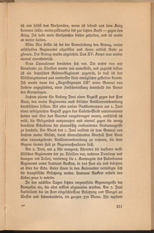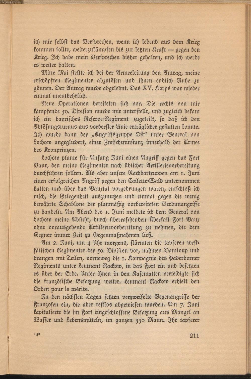 Lochow plante für Anfang Juni einen Angriff gegen das Fort Vaux, den meine Regimenter nach üblicher Artillerievorbereitung durchführen sollten. Als aber unsere Nachbartruppen am i. Juni einen erfolgreichen Angriff gegen den Cailette-Wald unternommen hatten und über das Vauxtal vorgedrungen waren, entschloß ich mich, die Gelegenheit auszunutzen und einmal gegen die wenig bewährte Schablone der planmäßig vorbereiteten Verdunangriffe zu handeln. Am Abend des l. Juni meldete ich dem General von Lochow meine Absicht, durch überraschenden Überfall Fort Vaux ohne vorausgehende Artillerievorbereitung zu nehmen, die dem Gegner immer Zeit zu Gegenmaßnahmen ließ.