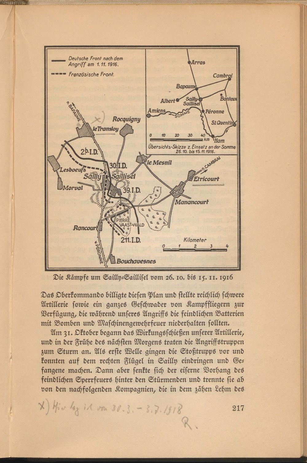 Am zi. Oktober begann das Wirkungsschießen unserer Artillerie, und in der Frühe des nächsten Morgens traten die Angriffstruppen zum Sturm an. Als erste Welle gingen die Stoßtrupps vor und konnten auf dem rechten Flügel in Sailly eindringen und Gefangene machen. Dann aber senkte sich der eiserne Vorhang des feindlichen Sperrfeuers hinter den Stürmenden und trennte sie ab von den nachfolgenden Kompagnien, die in dem zähen Lehm des