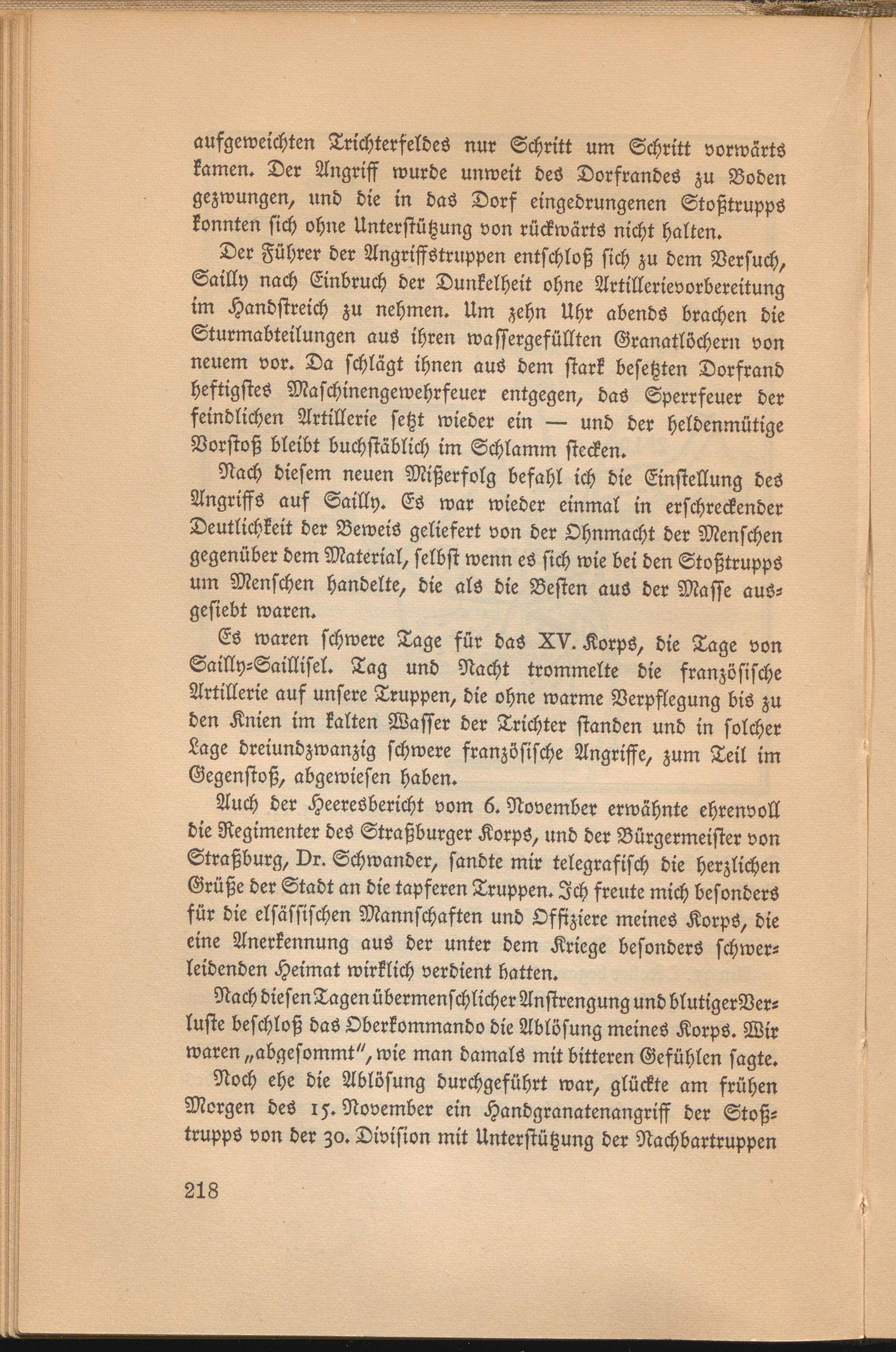 Auch der Heeresbericht vom 6. November erwähnte ehrenvoll die Regimenter des Straßburger KorpS, und der Bürgermeister von Straßburg, Dr. Schwanker, sandte mir telegrafisch die herzlichen Grüße der Stadt an die tapferen Truppen. Ich freute mich besonders für die elsässischen Mannschaften und Offiziere meines Korps, die eine Anerkennung aus der unter dem Kriege besonders schwerleidenden Heimat wirklich verdient batten.