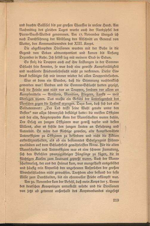 Am zo. November kam der Befehl, daß mein Korps der 5. Armee deS deutschen Kronprinzen unterstellt würde und die Divisionen von jetzt ab getrennt außerhalb des KorpöverbandeS eingesetzt