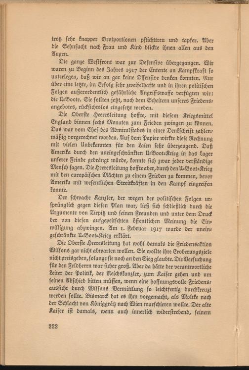 Die Oberste Heeresleitung hoffte, mit diesem KriegSmittel England binnen sechs Monaten zum Frieden zwingen zu können. Das war vom Chef des Admiralstabes in einer Denkschrift zahlenmäßig vorgerechnet worden. Auf dem Papier wirkte diese Rechnung mit vielen Unbekannten für den Laien sehr überzeugend. Daß Amerika durch den uneingeschränkten U-Boot-Krieg in das Lager unserer Feinde gedrängt würde, konnte sich zwar jeder verständige Mensch sagen. Die Heeresleitung hoffte aber,durch den U-Boot-Krieg mit den europäischen Mächten zu einem Frieden zu kommen, bevor Amerika mit wesentlichen Streitkräften in den Kampf eingreifen konnte.