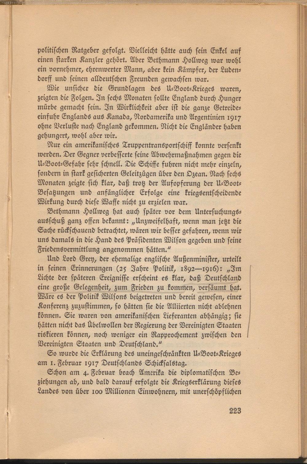 Und Lord Grey, der ehemalige englische Außenminister, urteilt in seinen Erinnerungen (25 Jahre Politik, 1892—1916): „Im Lichte der späteren Ereignisse erscheint es klar, daß Deutschland eine große Gelegenheit, zum Frieden zu kommen, versäumt hat. Wäre es der Politik WilsonS beigetreten und bereit gewesen, einer Konferenz zuzustimmen, so hätten sie die Alliierten nicht ablehnen können. Sie waren von amerikanischen Lieferanten abhängig; sie hätten nicht das Übelwollen der Regierung der Vereinigten Staaten riskieren können, noch weniger ein Rapprochement zwischen den Vereinigten Staaten und Deutschland."