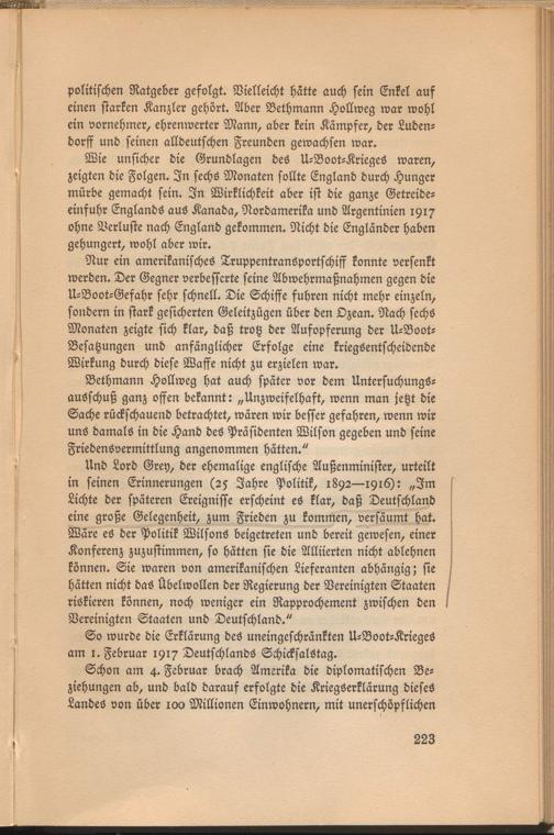 politischen Ratgeber gefolgt. Vielleicht hätte auch sein Enkel auf einen starken Kanzler gehört. Aber Bethmann Hollweg war wohl ein vornehmer, ehrenwerter Mann, aber kein Kämpfer, der Luden- dorff und seinen alldeutschen Freunden gewachsen war.