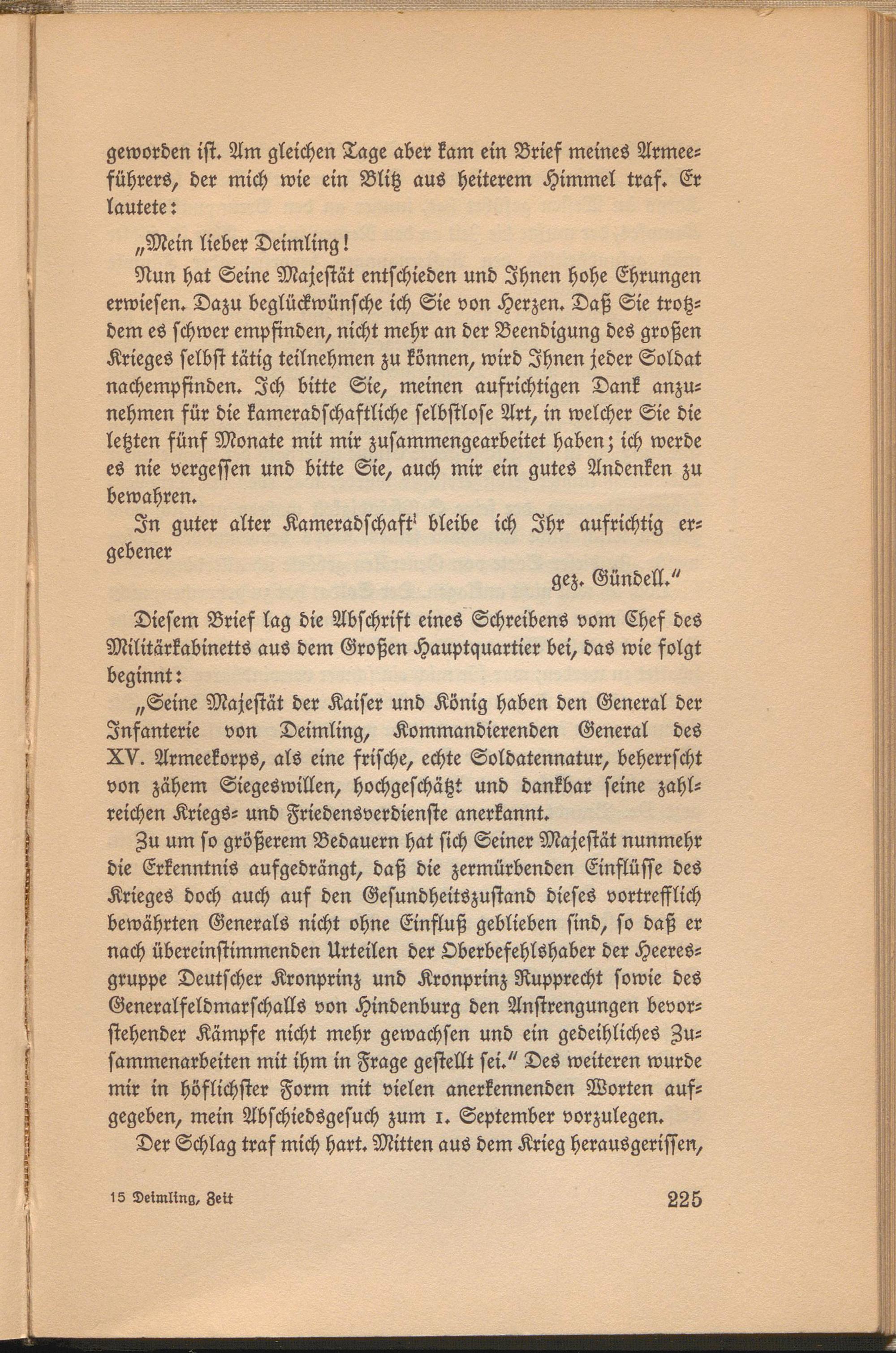 Au um so größerem Bedauern hat sich Seiner Majestät nunmehr die Erkenntnis aufgedrängt, daß die zermürbenden Einflüsse des Krieges doch auch auf den Gesundheitszustand dieses vortrefflich bewährten Generals nicht ohne Einfluß geblieben sind, so daß er nach übereinstimmenden Urteilen der Oberbefehlshaber der Heeresgruppe Deutscher Kronprinz und Kronprinz Rupprecht sowie des Generalfeldmarschalls von Hindenburg den Anstrengungen bevorstehender Kämpfe nicht mehr gewachsen und ein gedeihliches Zusammenarbeiten mit ihm in Frage gestellt sei." Des weiteren wurde mir in höflichster Form mit vielen anerkennenden Worten aufgegeben, mein Abschiedsgesuch zum i. September vorzulegen.