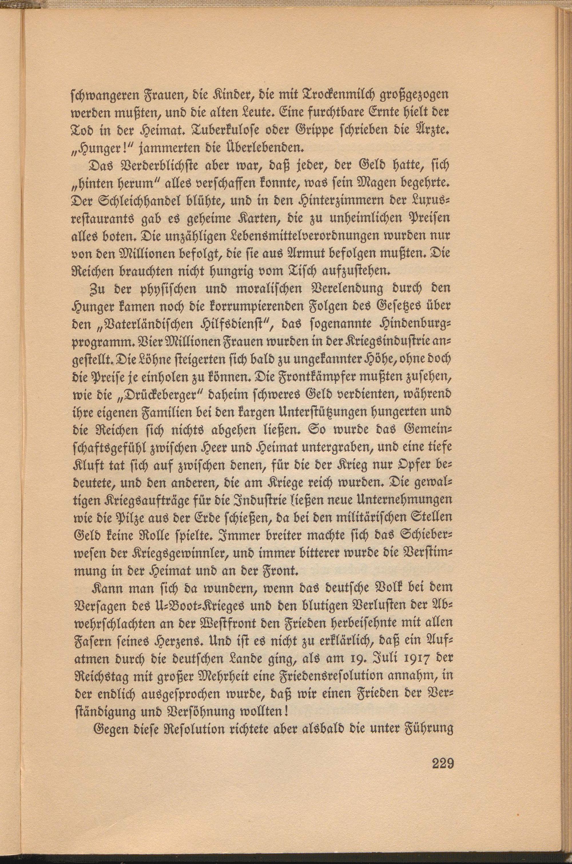 Kann man sich da wundern, wenn das deutsche Volk bei dem Versagen des U-Boot-Krieges und den blutigen Verlusten der Abwehrschlachten an der Westfront den Frieden herbeisehnte mit allen Fasern seines Herzens. Und ist es nicht zu erklärlich, daß ein Aufatmen durch die deutschen Lande ging, als am 19. Juli 1917 der Reichstag mit großer Mehrheit eine Friedensresolution annahm, in der endlich ausgesprochen wurde, daß wir einen Frieden der Verständigung und Versöhnung wollten!