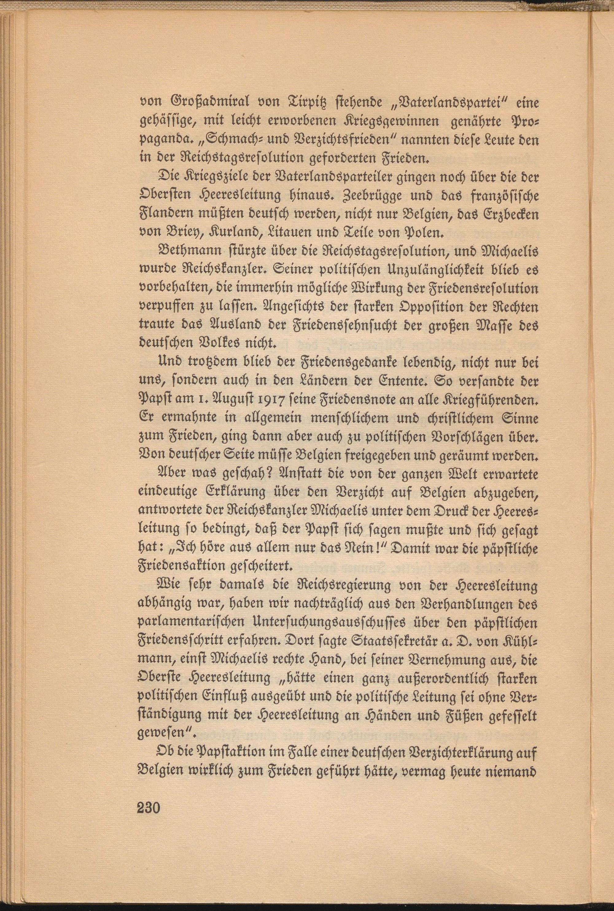 Wie sehr damals die Reichsregierung von der Heeresleitung abhängig war, haben wir nachträglich aus den Verhandlungen des parlamentarischen Untersuchungsausschusses über den päpstlichen Friedensschritt erfahren. Dort sagte Staatssekretär a. D. von Kühlmann, einst Michaelis rechte Hand, bei seiner Vernehmung aus, die Oberste Heeresleitung „hätte einen ganz außerordentlich starken politischen Einfluß ausgeübt und die politische Leitung sei ohne Verständigung mit der Heeresleitung an Händen und Füßen gefesselt gewesen".