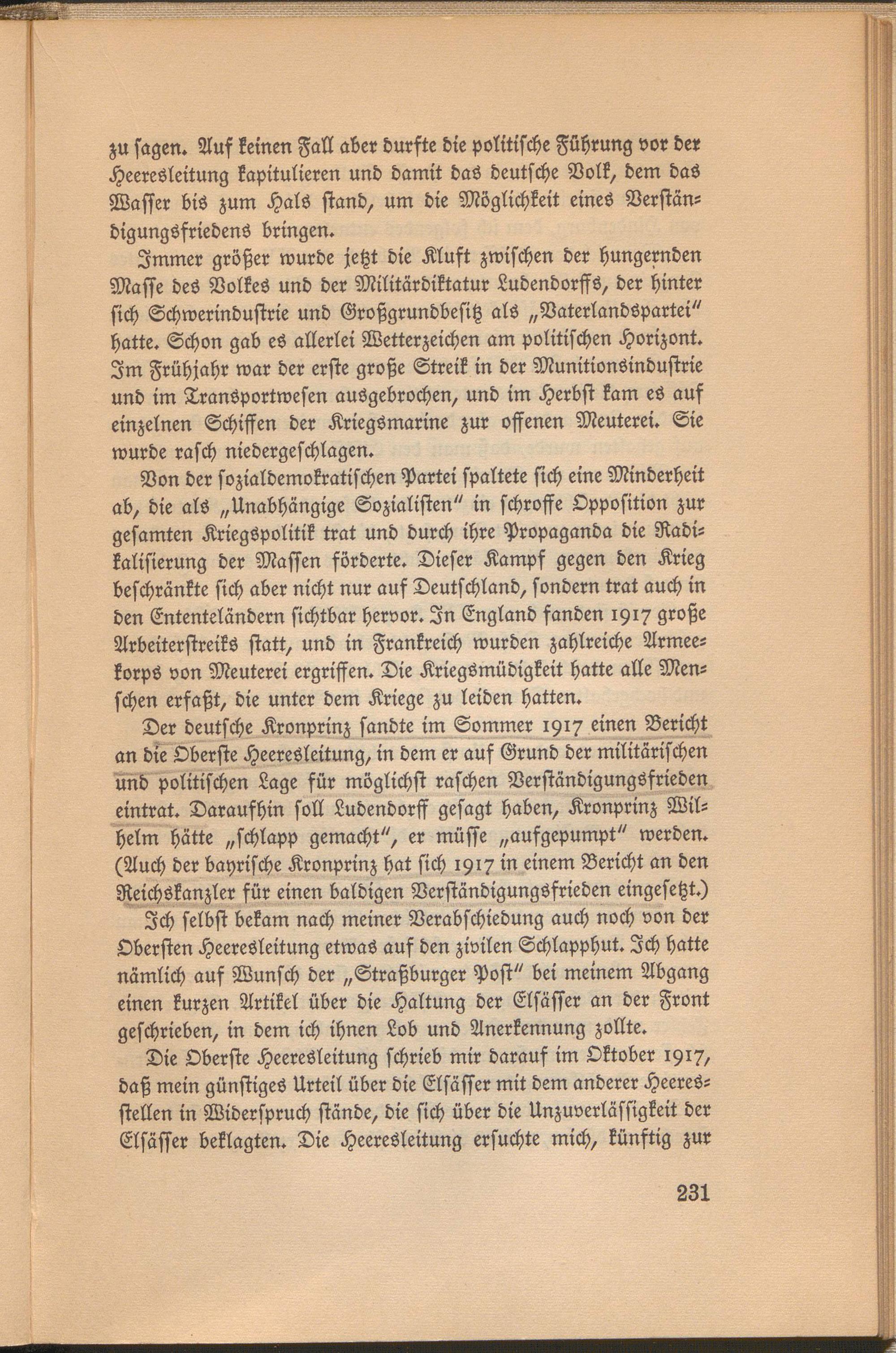 Die Oberste Heeresleitung schrieb mir darauf im Oktober 1917, daß mein günstiges Urteil über die Elsässer mit dem anderer Heeresstellen in Widerspruch stände, die sich über die Unzuverlässigkeit der Elsässer beklagten. Die Heeresleitung ersuchte mich, künftig zur
