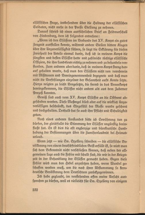 „Wenn ich den Elsässern im Verbände des XV. Korps ein gutes Zeugnis ausstellen konnte, während andere Stellen bittere Klagen über ihre Unzuverlässigkeit führen, so liegt die Erklärung für diesen Zwiespalt der Urteile einmal darin, daß ich in meinem Korps die jüngsten und besten Elsässer hatte und zahlreiche tüchtige elsässische Offiziere, die ihre Landsleute richtig zu nehmen und zu behandeln verstanden. Zum anderen aber darin, daß in meinem Korps streng darauf gehalten wurde, daß man den Elsässern nicht von vornherein mit Mißtrauen und Voreingenommenheit begegnete und daß man nicht die Verfehlungen einzelner der Gesamtheit aufs Konto setzte. Hierzu neigten zu leicht Vorgesetzte, die fremd in das Armeekorps hereingekommen, die Elsässer nicht anders als aus dem Zaberner Prozeß kannten.