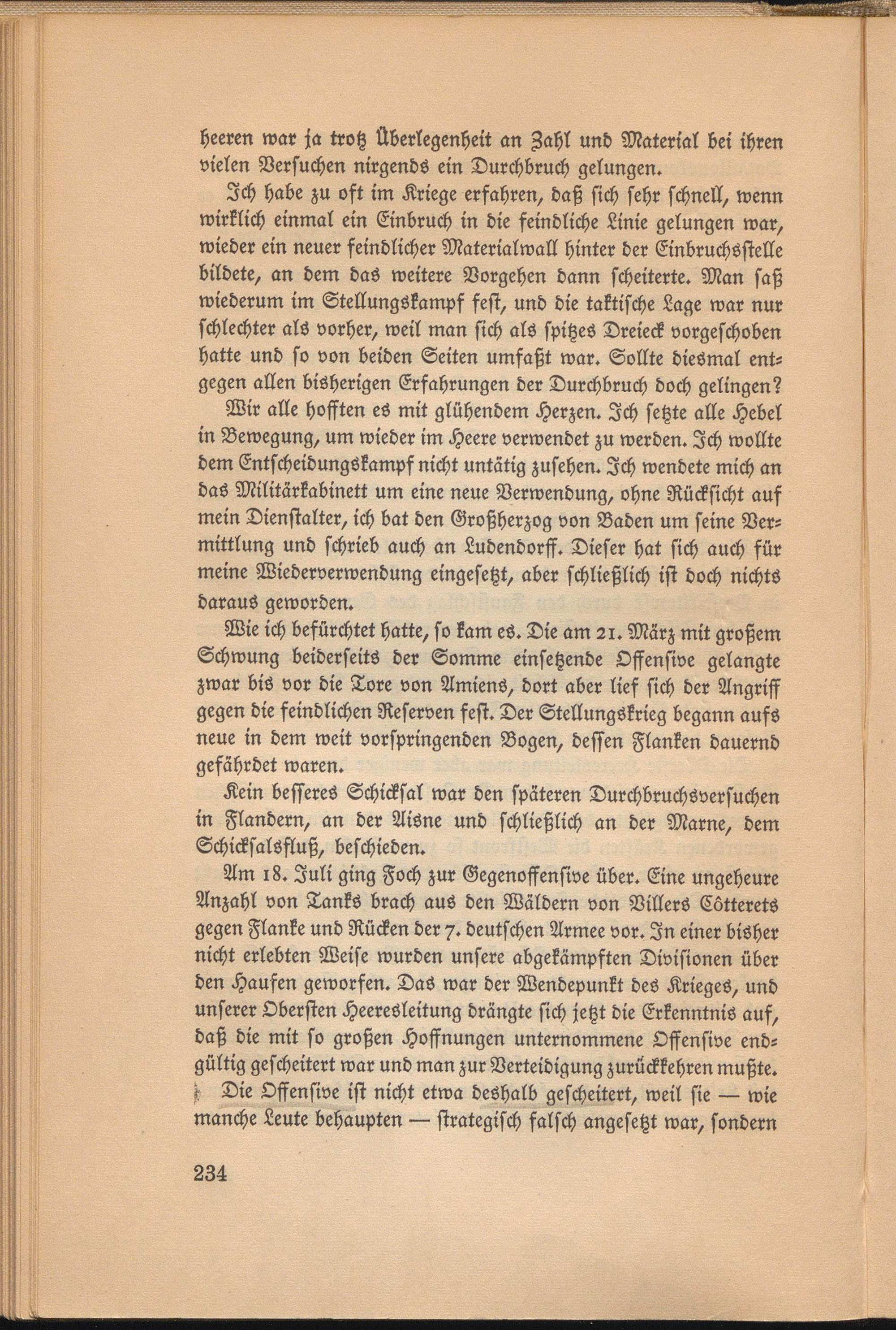 Wir alle hofften eS mit glühendem Herzen. Ich setzte alle Hebel in Bewegung, um wieder im Heere verwendet zu werden. Ich wollte dem Entscheidungskampf nicht untätig zusehen. Ich wendete mich an das Militärkabinett um eine neue Verwendung, ohne Rücksicht auf mein Dienstalter, ich bat den Großherzog von Baden um seine Vermittlung und schrieb auch an Ludendorff. Dieser hat sich auch für meine Wiederverwendung eingesetzt, aber schließlich ist doch nichts daraus geworden.