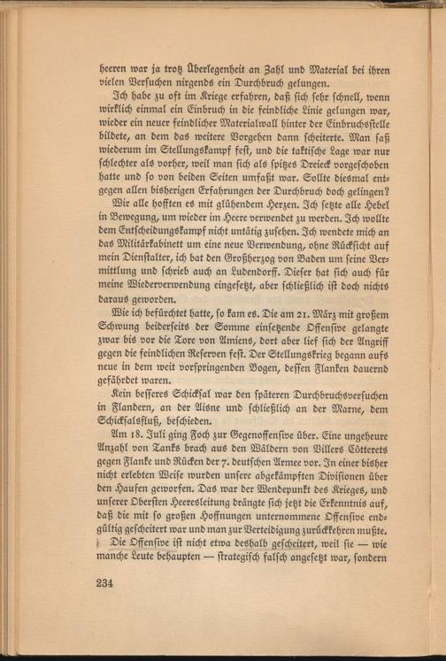 Am 18. Juli ging Foch zur Gegenoffensive über. Eine ungeheure Anzahl von Tanks brach aus den Wäldern von Villers Cütterets gegen Flanke und Rücken der 7. deutschen Armee vor. In einer bisher nicht erlebten Weise wurden unsere abgekämpften Divisionen über den Haufen geworfen. Das war der Wendepunkt des Krieges, und unserer Obersten Heeresleitung drängte sich jetzt die Erkenntnis auf, daß die mit so großen Hoffnungen unternommene Offensive endgültig gescheitert war und man zur Verteidigung zurückkehren mußte, r Die Offensive ist nicht etwa deshalb gescheitert, weil sie — wie manche Leute behaupten — strategisch falsch angesetzt war, sondern