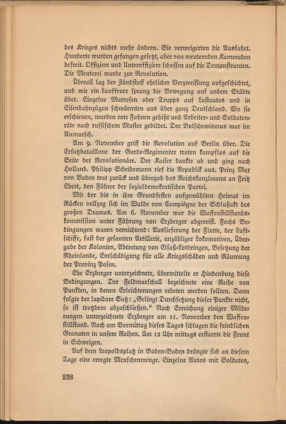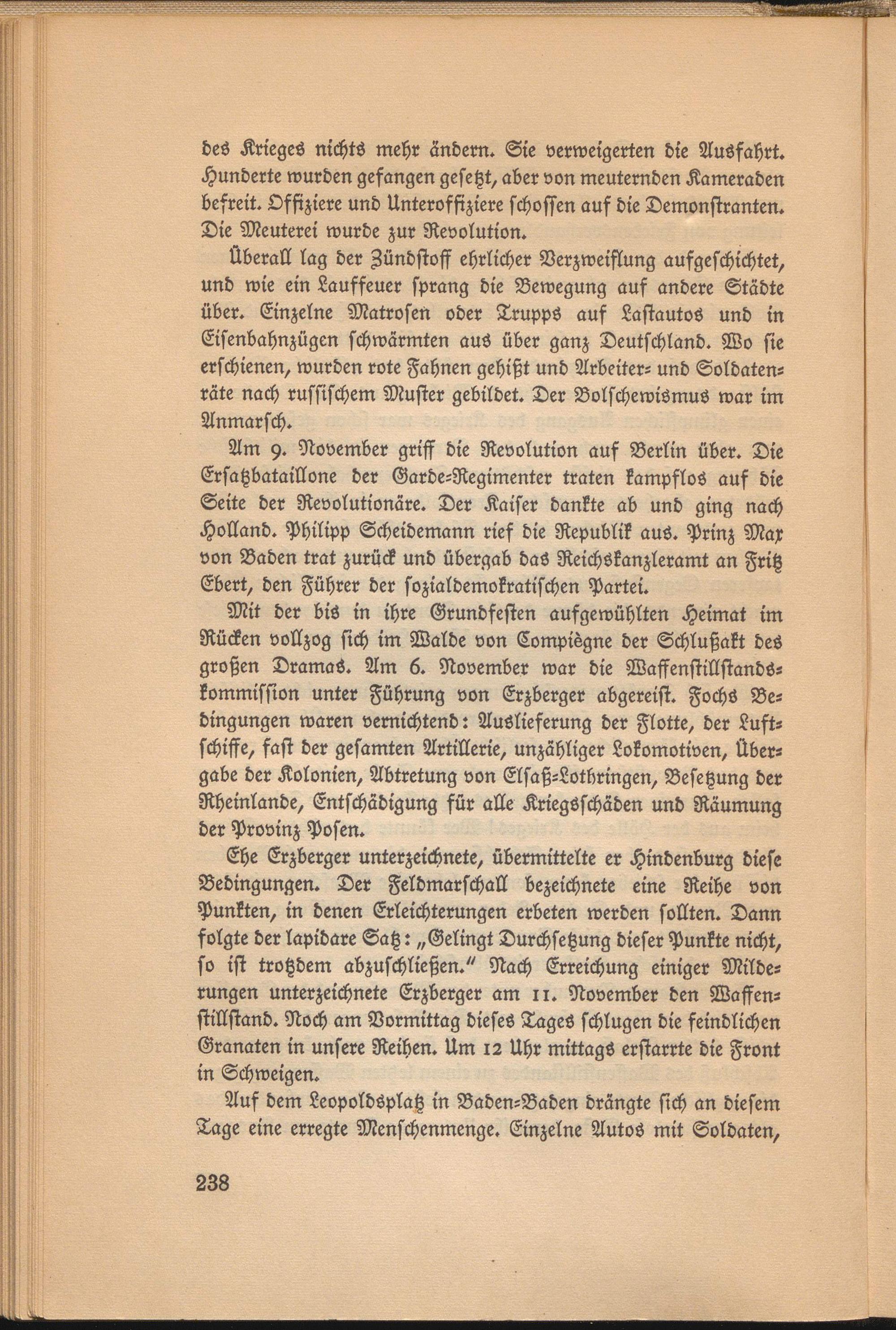 Mit der bis in ihre Grundfesten aufgewühlten Heimat im Rücken vollzog sich im Walde von Compiegne der Schlußakt des großen DramaS. Am 6. November war die Waffenstillstandskommission unter Führung von Erzberger abgereist. FochS Bedingungen waren vernichtend: Auslieferung der Flotte, der Luftschiffe, fast der gesamten Artillerie, unzähliger Lokomotiven, Übergabe der Kolonien, Abtretung von Elsaß-Lotbringen, Besetzung der Rheinlande, Entschädigung für alle Kriegsschäden und Räumung der Provinz Posen.