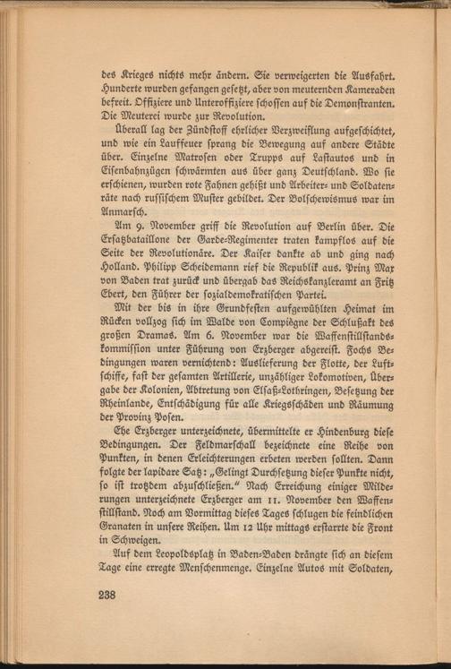 Ehe Erzberger unterzeichnete, übermittelte er Hindenburg diese Bedingungen. Der Feldmarschall bezeichnete eine Reihe von Punkten, in denen Erleichterungen erbeten werden sollten. Dann folgte der lapidare Satz: „Gelingt Durchsetzung dieser Punkte nicht, so ist trotzdem abzuschließen." Nach Erreichung einiger Milderungen unterzeichnete Erzberger am n. November den Waffenstillstand. Noch am Vormittag dieses Tages schlugen die feindlichen Granaten in unsere Reihen. Um 12 Uhr mittags erstarrte die Front in Schweigen«