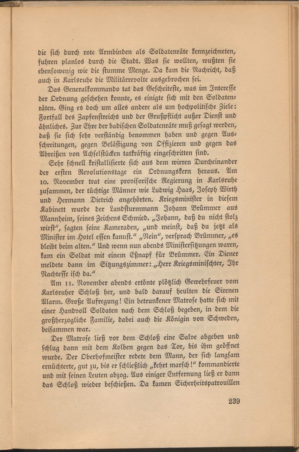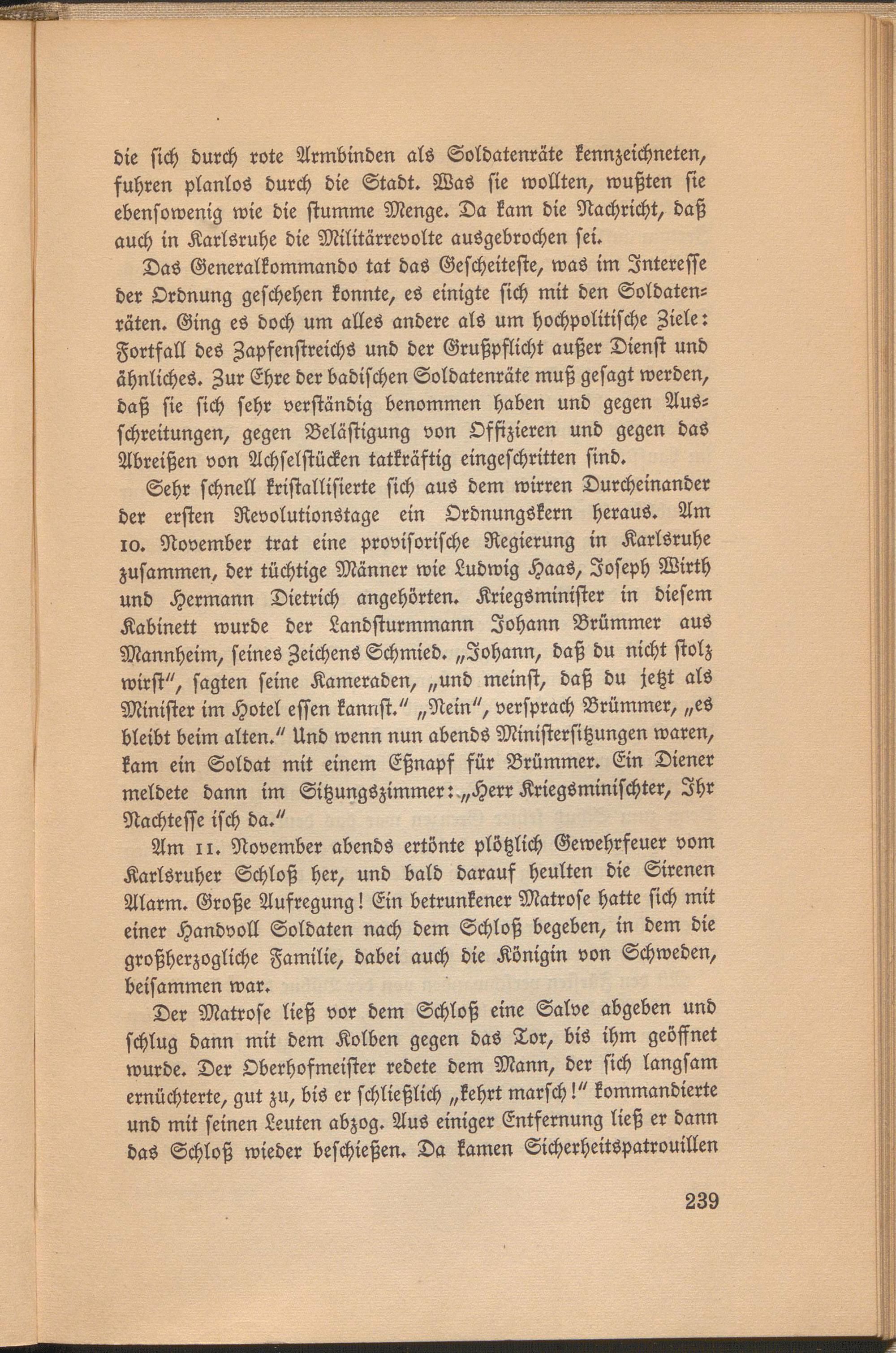 Das Generalkommando tat das Gescheiteste, was im Interesse der Ordnung geschehen konnte, es einigte sich mit den Soldatenräten. Ging es doch um alles andere als um hochpolitische Ziele: Fortfall des Zapfenstreichs und der Grußpflicht außer Dienst und ähnliches. Zur Ehre der badischen Soldatenräte muß gesagt werden, daß sie sich sehr verständig benommen haben und gegen Ausschreitungen, gegen Belästigung von Offizieren und gegen das Abreißen von Achselstücken tatkräftig eingeschritten sind.