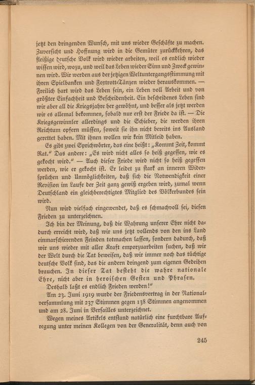 Ich bin der Meinung, daß die Wahrung unserer Ehre nicht dadurch erreicht wird, daß wir unS jetzt vollends von den ins Land einmarschierenden Feinden totmachen lassen, sondern dadurch, daß wir uns wieder mit aller Kraft emporzuarbeiten suchen, daß wir der Welt durch die Tat beweisen, daß wir immer noch das tüchtige deutsche Volk sind, das die andern dringend zum eigenen Gedeihen brauchen. In dieser Tat besteht die wahre nationale Ehre, nicht aber in heroischen Gesten und Phrasen.