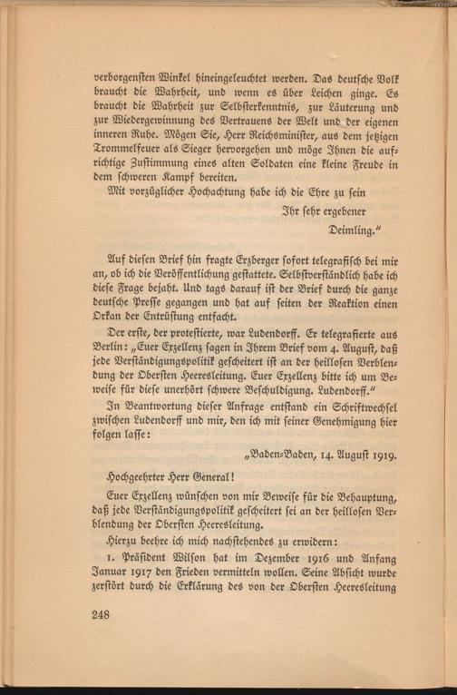 Auf diesen Brief hin fragte Erzberger sofort telegrafisch bei mir an, ob ich die Veröffentlichung gestattete. Selbstverständlich habe ich diese Frage bejaht. Und tags darauf ist der Brief durch die ganze deutsche Presse gegangen und hat auf feiten der Reaktion einen Orkan der Entrüstung entfacht.
