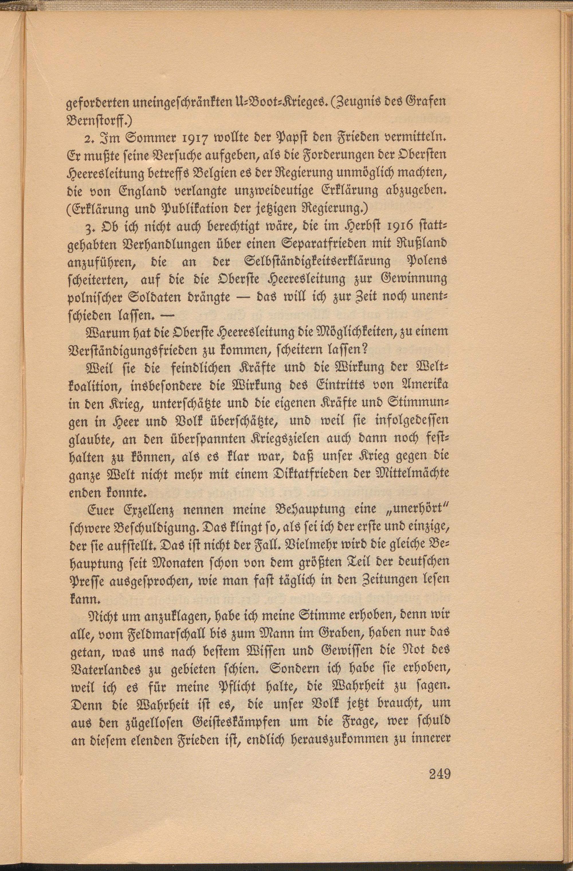 Nicht um anzuklagen, habe ich meine Stimme erhoben, denn wir alle, vom Feldmarschall bis zum Mann im Graben, haben nur das getan, was uns nach bestem Wissen und Gewissen die Not des Vaterlandes zu gebieten schien. Sondern ich habe sie erhoben, weil ich es für meine Pflicht halte, die Wahrheit zu sagen. Denn die Wahrheit ist es, die unser Volk jetzt braucht, um aus den zügellosen Geisteskämpfen um die Frage, wer schuld an diesem elenden Frieden ist, endlich herauszukommen zu innerer