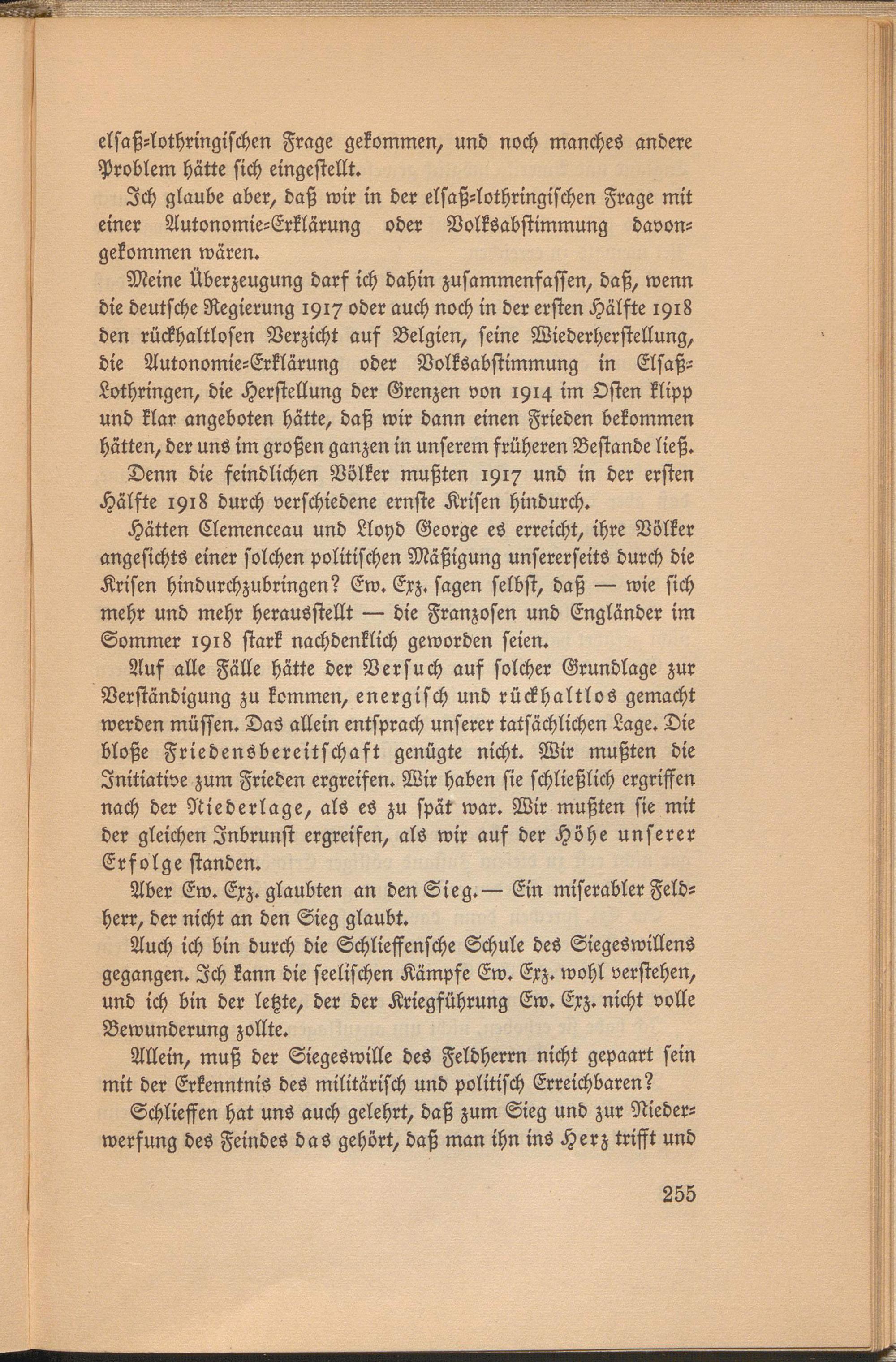 Meine Überzeugung darf ich dahin zusammenfassen, daß, wenn die deutsche Regierung 1917 oder auch noch in der ersten Hälfte 1918 den rückhaltlosen Verzicht auf Belgien, seine Wiederherstellung, die Autonomie-Erklärung oder Volksabstimmung in Elsaß- Lothringen, die Herstellung der Grenzen von 1914 im Osten klipp und klar angeboten hätte, daß wir dann einen Frieden bekommen hätten, der uns im großen ganzen in unserem früheren Bestände ließ.