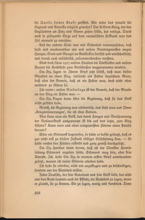 Ew. Exz. sprechen dann davon, daß ich der Obersten Heeresleitung Schweres angetan hätte. Schweres mag sein, aber kein Unrecht. Ich habe Ew. Exz. in meinem ersten Brief auseinandergesetzt, warum ich meine Stimme erhoben habe.