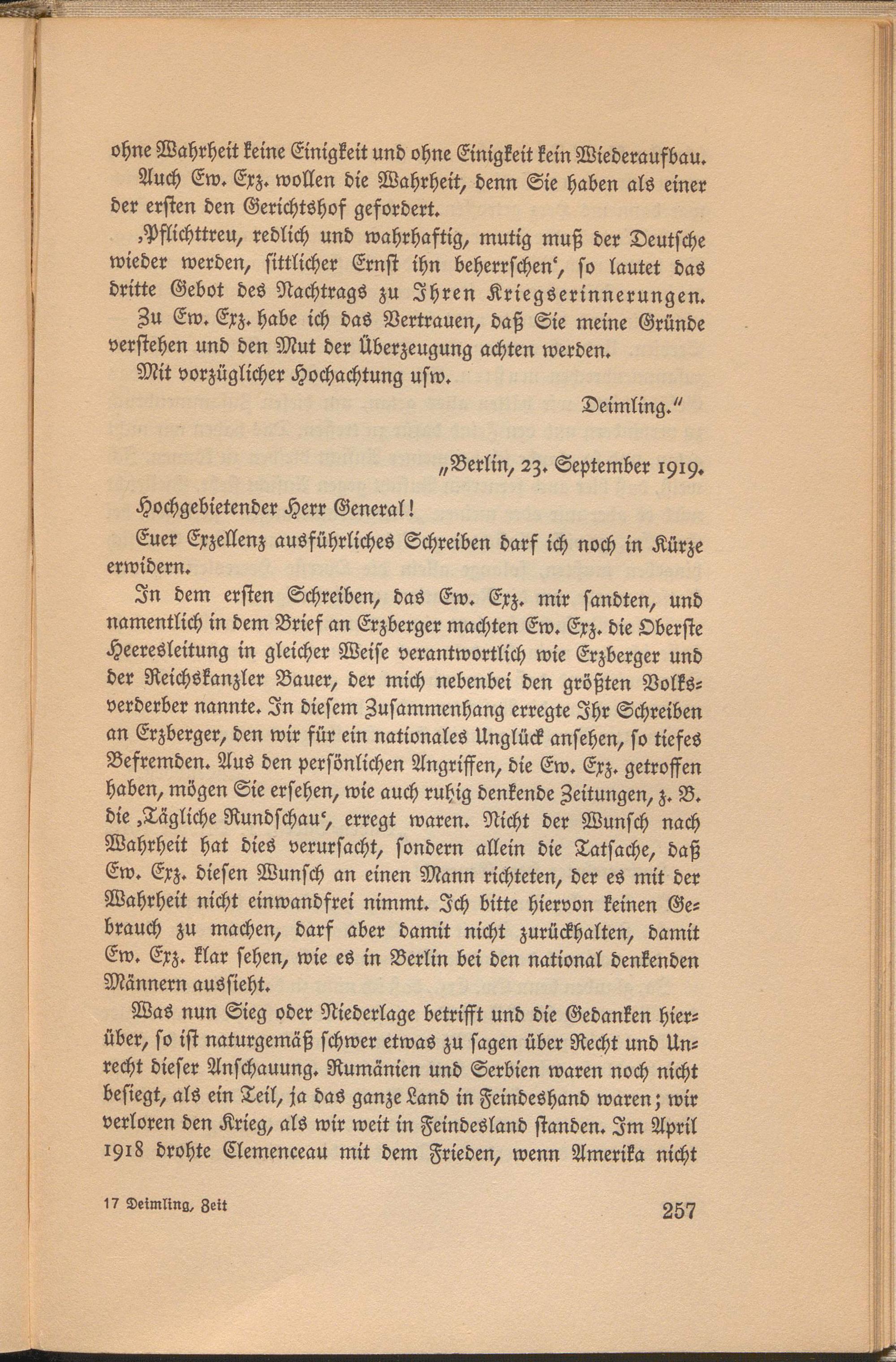 In dem ersten Schreiben, das Ew. Exz. mir sandten, und namentlich in dem Brief an Erzberger machten Ew. Exz. die Oberste Heeresleitung in gleicher Weise verantwortlich wie Erzberger und der Reichskanzler Bauer, der mich nebenbei den größten Volks- verderber nannte. In diesem Zusammenhang erregte Ihr Schreiben an Erzberger, den wir für ein nationales Unglück ansehen, so tiefes Befremden. Aus den persönlichen Angriffen, die Ew. Exz. getroffen haben, mögen Sie ersehen, wie auch ruhig denkende Zeitungen, z. B. die-Tägliche Rundschau', erregt waren. Nicht der Wunsch nach Wahrheit hat dies verursacht, sondern allein die Tatsache, daß Ew. Exz. diesen Wunsch an einen Mann richteten, der es mit der Wahrheit nicht einwandfrei nimmt. Ich bitte hiervon keinen Gebrauch zu machen, darf aber damit nicht zurückhalten, damit Ew. Exz. klar sehen, wie es in Berlin bei den national denkenden Männern aussieht.