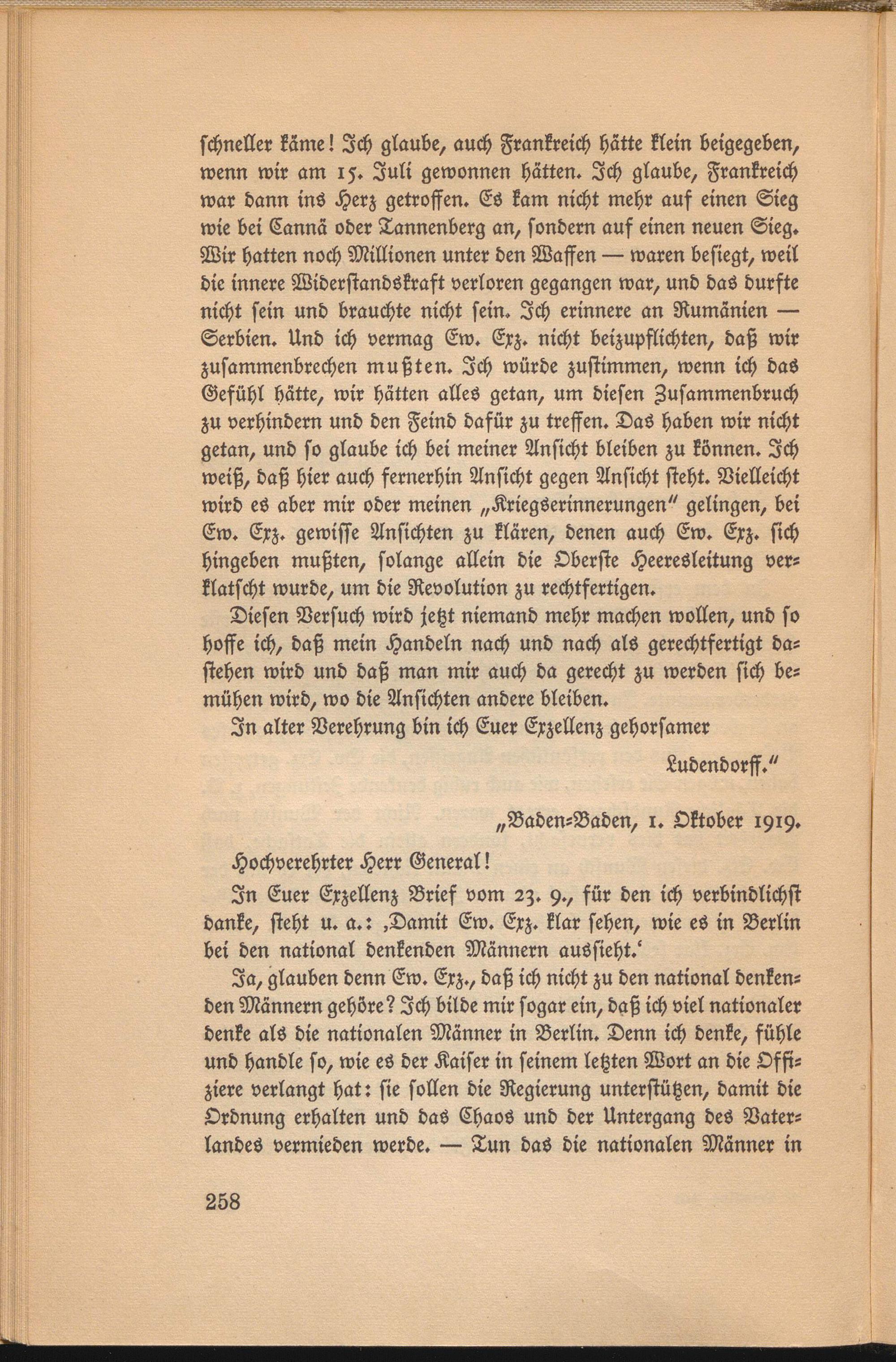 schneller käme! Ich glaube, auch Frankreich hätte klein beigegeben, wenn wir am 15. Juli gewonnen hätten. Ich glaube, Frankreich war dann ins Herz getroffen. ES kam nicht mehr auf einen Sieg wie bei Cannä oder Tannenberg an, sondern auf einen neuen Sieg. Wir hatten noch Millionen unter den Waffen — waren besiegt, weil die innere Widerstandskraft verloren gegangen war, und das durfte nicht sein und brauchte nicht sein. Ich erinnere an Rumänien — Serbien. Und ich vermag Ew. Exz. nicht beizupflichten, daß wir zusammenbrechen mußten. Ich würde zustimmen, wenn ich das Gefühl hätte, wir hätten alles getan, um diesen Zusammenbruch zu verhindern und den Feind dafür zu treffen. Das haben wir nicht getan, und so glaube ich bei meiner Ansicht bleiben zu können. Ich weiß, daß hier auch fernerhin Ansicht gegen Ansicht steht. Vielleicht wird es aber mir oder meinen „Kriegserinnerungen" gelingen, bei Ew. Exz. gewisse Ansichten zu klären, denen auch Ew. Exz. sich hingeben mußten, solange allein die Oberste Heeresleitung verklatscht wurde, um die Revolution zu rechtfertigen.