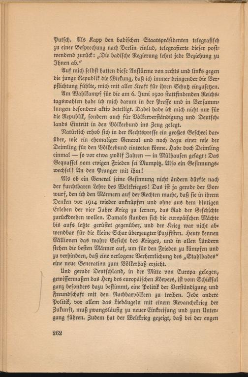 Am Wahlkamps für die am 6. Juni 1920 stattfindenden Reichs- tagöwahlen habe ich mich darum in der Presse und in Versammlungen besonders aktiv beteiligt. Dabei habe ich mich nicht nur für die Republik, sondern auch für Völkerverständigung und Deutschlands Eintritt in den Völkerbund ins Zeug gelegt.