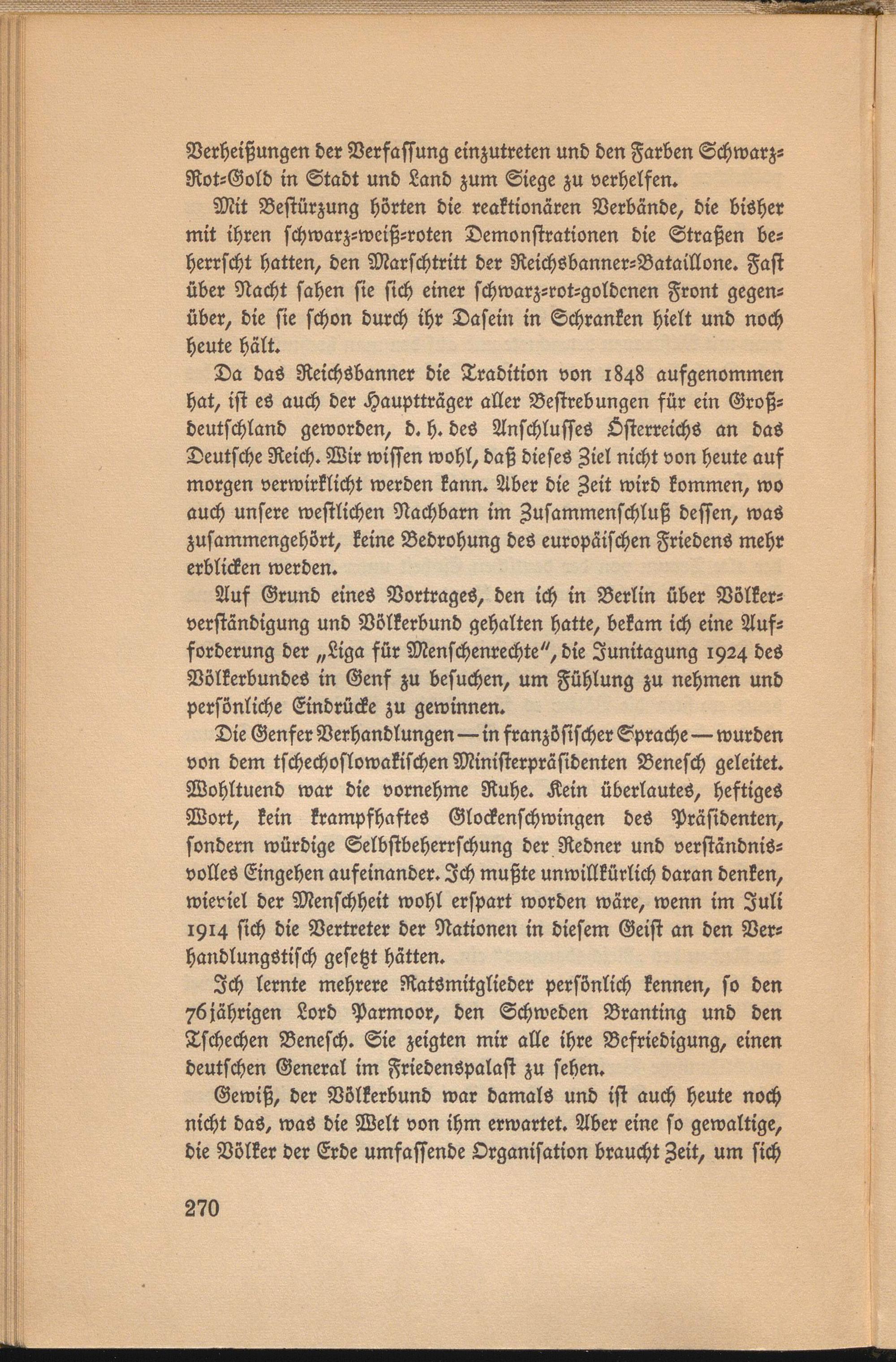 Die Genfer Verhandlungen—in französischer Sprache—wurden von dem tschechoslowakischen Ministerpräsidenten Benesch geleitet. Wohltuend war die vornehme Ruhe. Kein überlautes, heftiges Wort, kein krampfhaftes Glockenschwingen des Präsidenten, sondern würdige Selbstbeherrschung der Redner und verständnisvolles Eingehen aufeinander. Ich mußte unwillkürlich daran denken, wieviel der Menschheit wohl erspart worden wäre, wenn im Juli 1914 sich die Vertreter der Nationen in diesem Geist an den Verhandlungstisch gesetzt hätten.