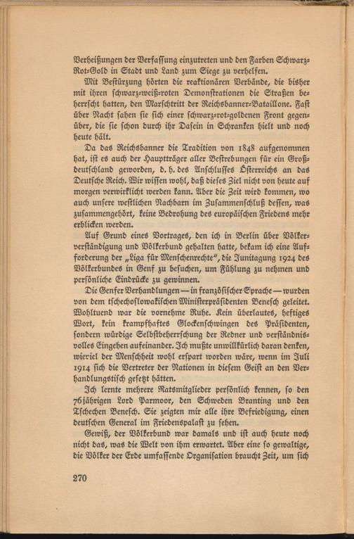 Auf Grund eines Vortrages, den ich in Berlin über Völkerverständigung und Völkerbund gehalten hatte, bekam ich eine Aufforderung der „Liga für Menschenrechte", die Junitagung 1924 des Völkerbundes in Genf zu besuchen, um Fühlung zu nehmen und persönliche Eindrücke zu gewinnen.