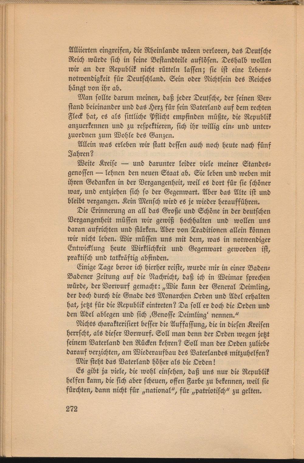 Einige Tage bevor ich hierher reiste, wurde mir in einer Baden- Badener Zeitung aus die Nachricht, daß ich in Weimar sprechen würde, der Vorwurf gemacht: „Wie kann der General Deimling, der doch durch die Gnade des Monarchen Orden und Adel erhalten hat, jetzt für die Republik eintreten? Da soll er doch die Orden und den Adel ablegen und sich -Genosse Deimling' nennen."