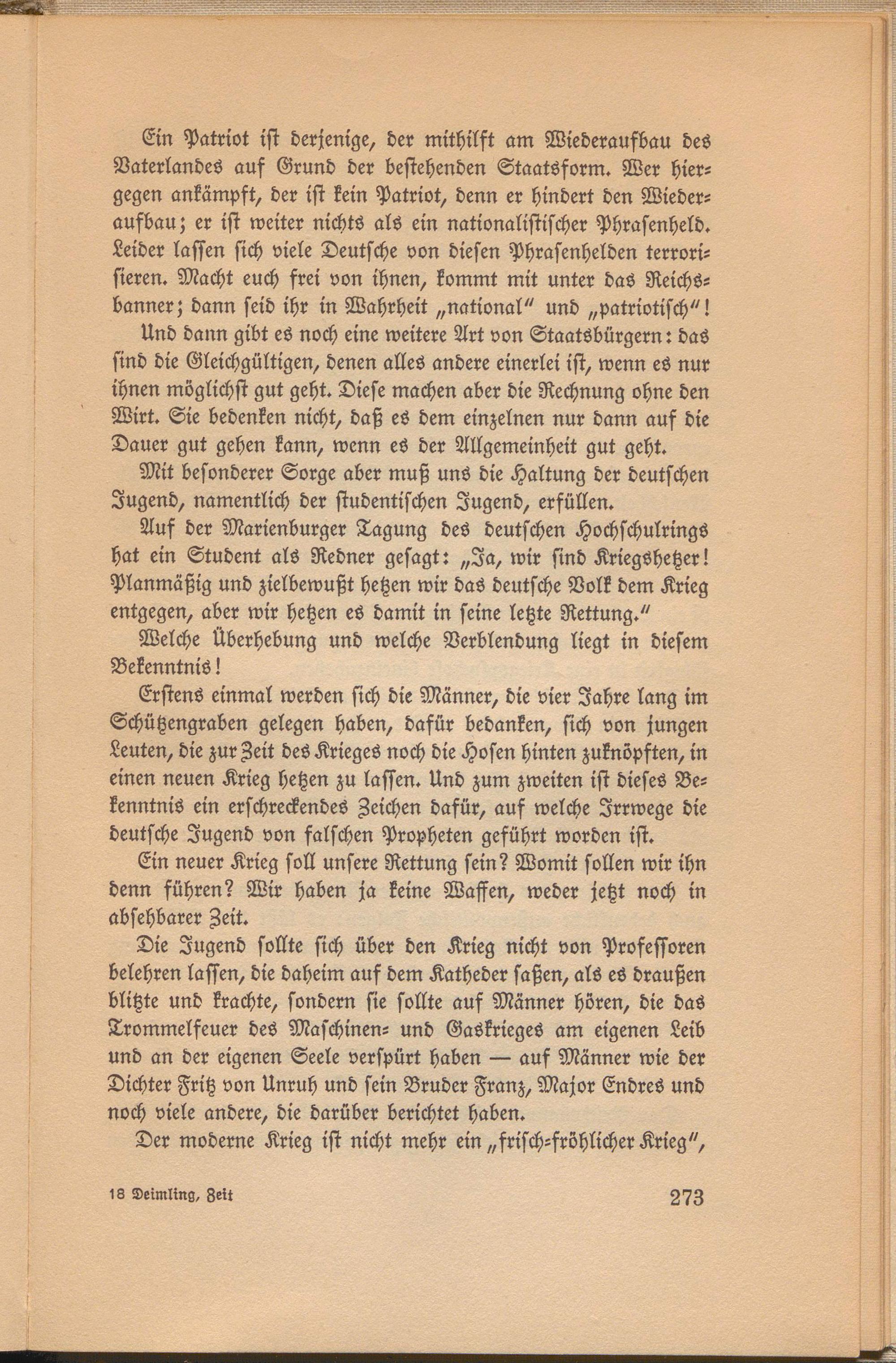 Erstens einmal werden sich die Männer, die vier Jahre lang im Schützengraben gelegen haben, dafür bedanken, sich von jungen Leuten, die zur Zeit des Krieges noch die Hosen hinten zuknöpften, in einen neuen Krieg hetzen zu lassen. Und zum zweiten ist dieses Bekenntnis ein erschreckendes Zeichen dafür, auf welche Irrwege die deutsche Jugend von falschen Propheten geführt worden ist.