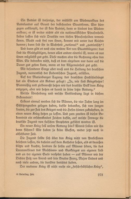 Die Jugend sollte sich über den Krieg nicht von Professoren belehren lassen, die daheim auf dem Katheder saßen, als es draußen blitzte und krachte, sondern sie sollte aus Männer hören, die das Trommelfeuer des Maschinen- und Gaskrieges am eigenen Leib und an der eigenen Seele verspürt haben — auf Männer wie der Dichter Fritz von Unruh und sein Bruder Franz, Major Endres und noch viele andere, die darüber berichtet haben.