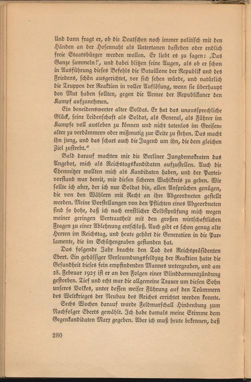 Sechs Wochen darauf wurde Feldmarschall Hindenburg zum Nachfolger Eberts gewählt. Ich habe damals meine Stimme dem Gegenkandidaten Marx gegeben. Aber ich muß heute bekennen, daß