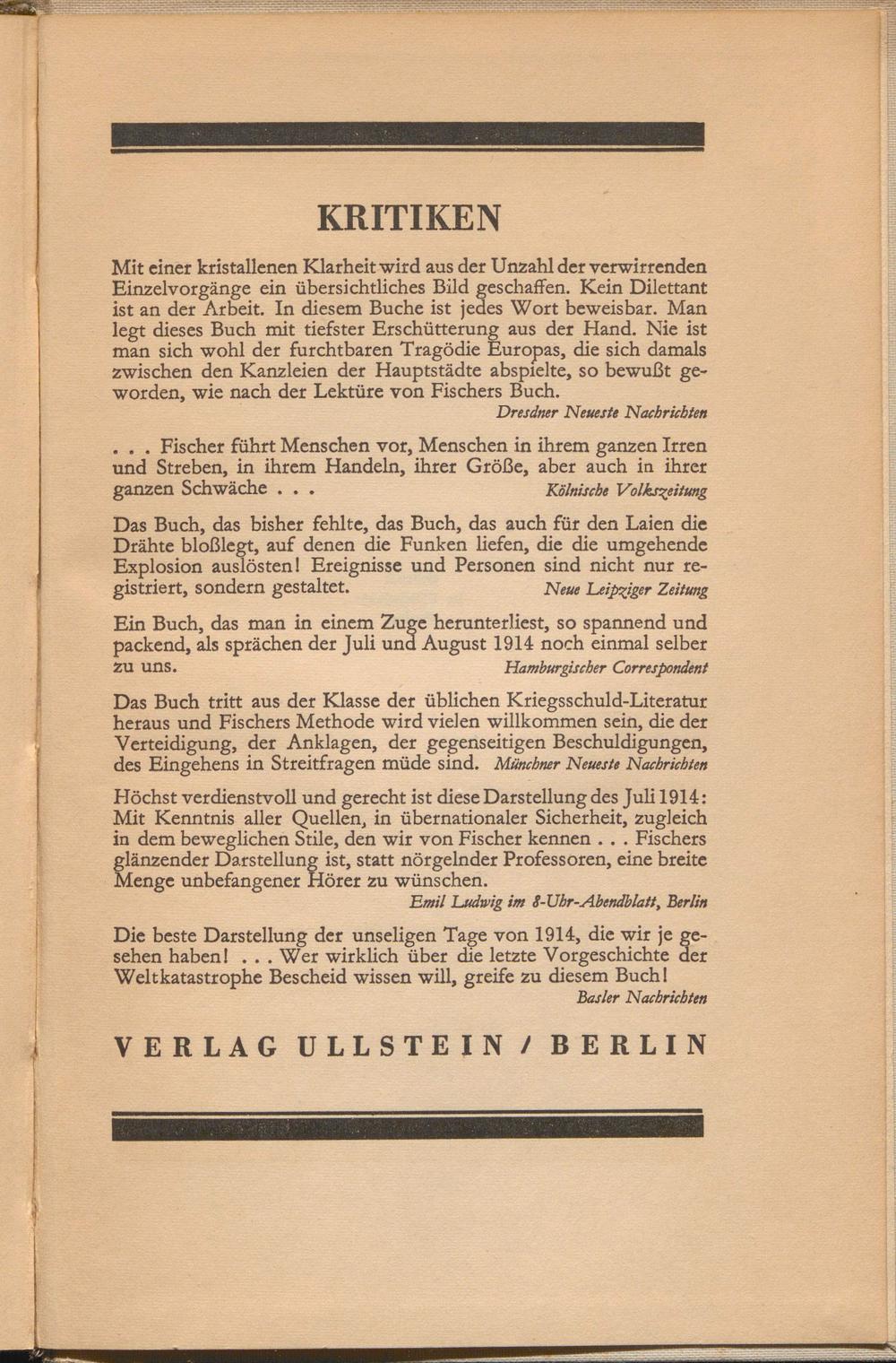 Hockst verdienstvoll und gereckt ist diese Darstellung des Juli 1914: Vlit Kenntnis aller (Quellen, in übernationaler Licberbeit, xugleicb in dem beweglicben 8rile, den wir von Liscber kennen . . . Liscbers glänzender Darstellung ist, statt nörgelnder krofessoren, eine breite lVlenge unbefangener Llörer ru wünscben.