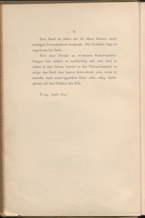 Wer aber Freude an leichteren Reisebeschreibungen hat, nehme es nachsichtig auf, und reist er selbst in den Orient, bereist er das Pharaonenland, so möge das Buch ihm kurzer Zeitvertreib sein, wenn er ausruht nach anstrengendem Ritte oder ruhig dahingleitet auf den Fluthen des Nils.