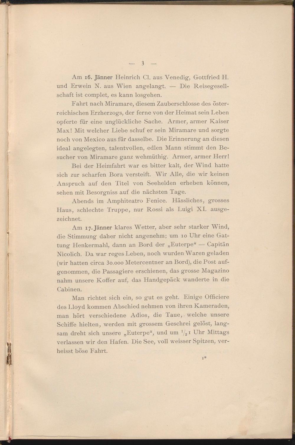 Am 17. Jänner klares Wetter, aber sehr starker Wind, die Stimmung daher nicht angenehm; um 10 Uhr eine Gattung Henkermahl, dann an Bord der „Euterpe“ — Capitän Nicolich. Da war reges Leben, noch wurden Waren geladen (wir hatten circa 3 o.ooo Metercentner an Bord), die Post aufgenommen, die Passagiere erschienen, das grosse Magazino nahm unsere Koffer auf, das Handgepäck wanderte in die Cabinen.