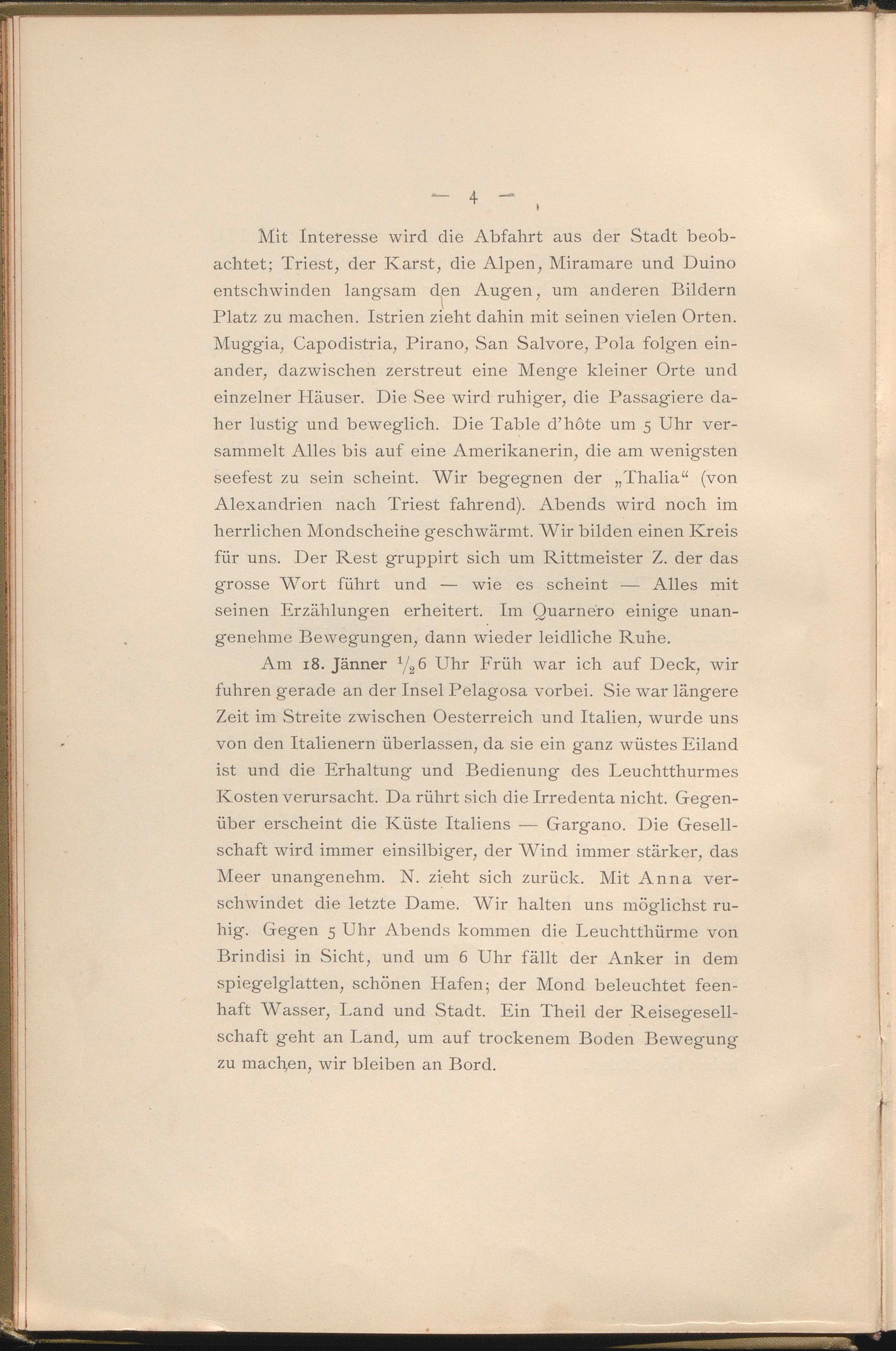 Mit Interesse wird die Abfahrt aus der Stadt beobachtet; Triest, der Karst, die Alpen, Miramare und Duino entschwinden langsam den Augen, um anderen Bildern Platz zu machen. Istrien zieht dahin mit seinen vielen Orten. Muggia, Capodistria, Pirano, San Salvore, Pola folgen einander, dazwischen zerstreut eine Menge kleiner Orte und einzelner Häuser. Die See wird ruhiger, die Passagiere daher lustig und beweglich. Die Table d’hote um 5 Uhr versammelt Alles bis auf eine Amerikanerin, die am wenigsten seefest zu sein scheint. Wir begegnen der „Thalia“ (von Alexandrien nach Triest fahrend). Abends wird noch im herrlichen Mondscheine geschwärmt. Wir bilden einen Kreis für uns. Der Rest gruppirt sich um Rittmeister Z. der das grosse Wort führt und — wie es scheint — Alles mit seinen Erzählungen erheitert. Im Quarnero einige unangenehme Bewegungen, dann wieder leidliche Ruhe.