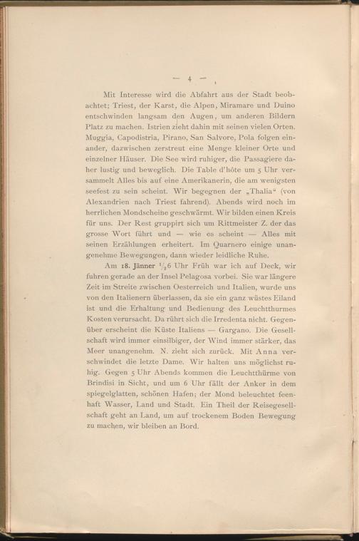 Am 18. Jänner 1 / 2 6 Uhr Früh war ich auf Deck, wir fuhren gerade an der Insel Pelagosa vorbei. Sie war längere Zeit im Streite zwischen Oesterreich und Italien, wurde uns von den Italienern überlassen, da sie ein ganz wüstes Eiland ist und die Erhaltung und Bedienung des Leuchtthurmes Kosten verursacht. Da rührt sich die Irredenta nicht. Gegenüber erscheint die Küste Italiens — Gargano. Die Gesellschaft wird immer einsilbiger, der Wind immer stärker, das Meer unangenehm. N. zieht sich zurück. Mit Anna verschwindet die letzte Dame. Wir halten uns möglichst ruhig. Gegen 5 Uhr Abends kommen die Leuchtthürme von Brindisi in Sicht, und um 6 Uhr fällt der Anker in dem spiegelglatten, schönen Hafen; der Mond beleuchtet feenhaft Wasser, Tand und Stadt. Ein Theil der Reisegesellschaft geht an Land, um auf trockenem Boden Bewegung zu machen, wir bleiben an Bord.