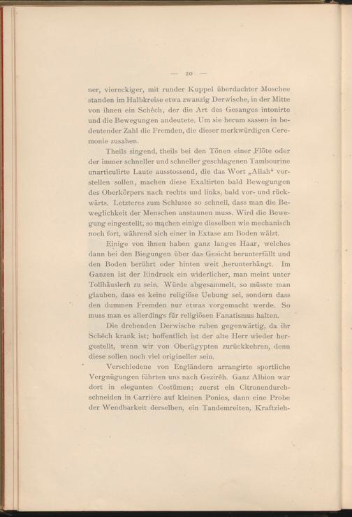 Theils singend, theils bei den Tönen einer Flöte oder der immer schneller und schneller geschlagenen Tambourine unarticulirte Laute ausstossend, die das Wort „Allah“ vorstellen sollen, machen diese Exaltirten bald Bewegungen des Oberkörpers nach rechts und links, bald vor- und rückwärts. Letzteres zum Schlüsse so schnell, dass man die Beweglichkeit der Menschen anstaunen muss. Wird die Bewegung eingestellt, so machen einige dieselben wie mechanisch noch fort, während sich einer in Extase am Boden wälzt.