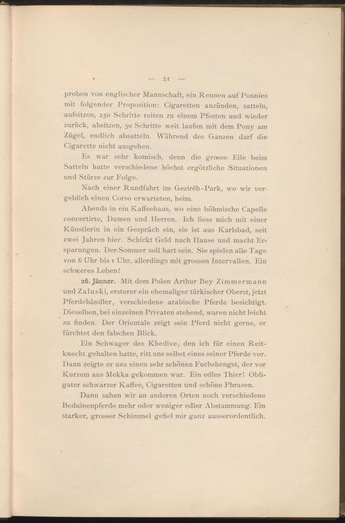 26. Jänner. Mit dem Polen Arthur Bey Zimmermann und Zaluski, ersterer ein ehemaliger türkischer Oberst, jetzt Pferdehändler, verschiedene arabische Pferde besichtigt. Dieselben, bei einzelnen Privaten stehend, waren nicht leicht zu finden. Der Orientale zeigt sein Pferd nicht gerne, er fürchtet den falschen Blick.