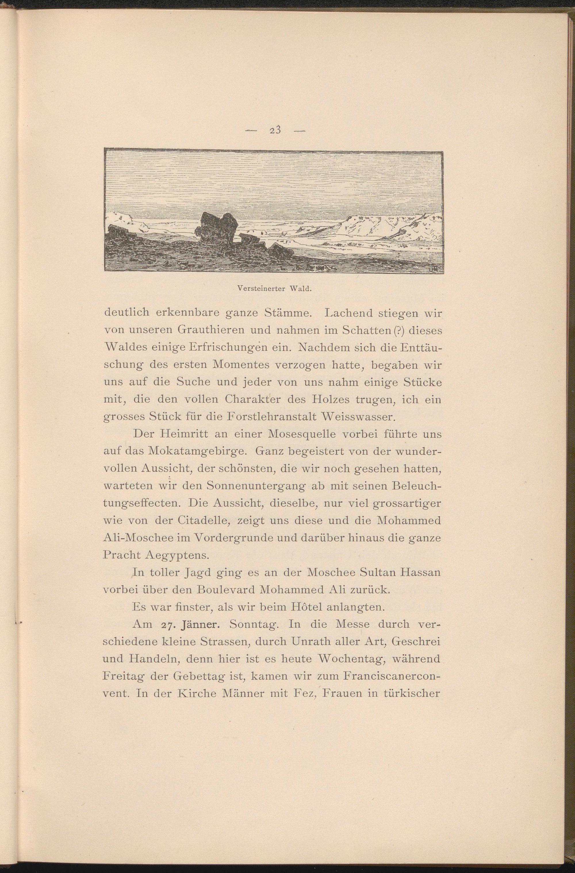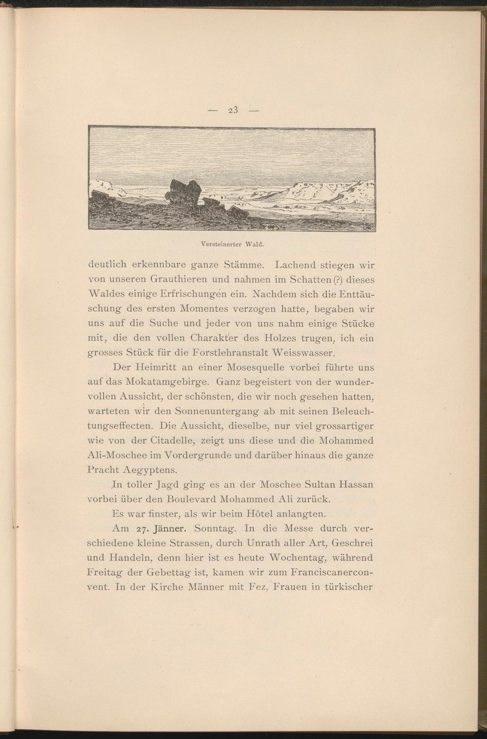 Der Heimritt an einer Mosesquelle vorbei führte uns auf das Mokatamgebirge. Ganz begeistert von der wundervollen Aussicht, der schönsten, die wir noch gesehen hatten, warteten wir den Sonnenuntergang ab mit seinen Beleuchtungseffecten. Die Aussicht, dieselbe, nur viel grossartiger wie von der Citadelle, zeigt uns diese und die Mohammed Ali-Moschee im Vordergründe und diirüber hinaus die ganze Pracht Aegyptens.