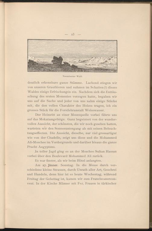 deutlich erkennbare ganze Stämme. Lachend stiegen wir von unseren Grauthieren und nahmen im Schatten (?) dieses Waldes einige Erfrischungen ein. Nachdem sich die Enttäuschung des ersten Momentes verzogen hatte, begaben wir uns auf die Suche und jeder von uns nahm einige Stücke mit, die den vollen Charakter des Holzes trugen, ich ein grosses Stück für die Forstlehranstalt Weisswasser.