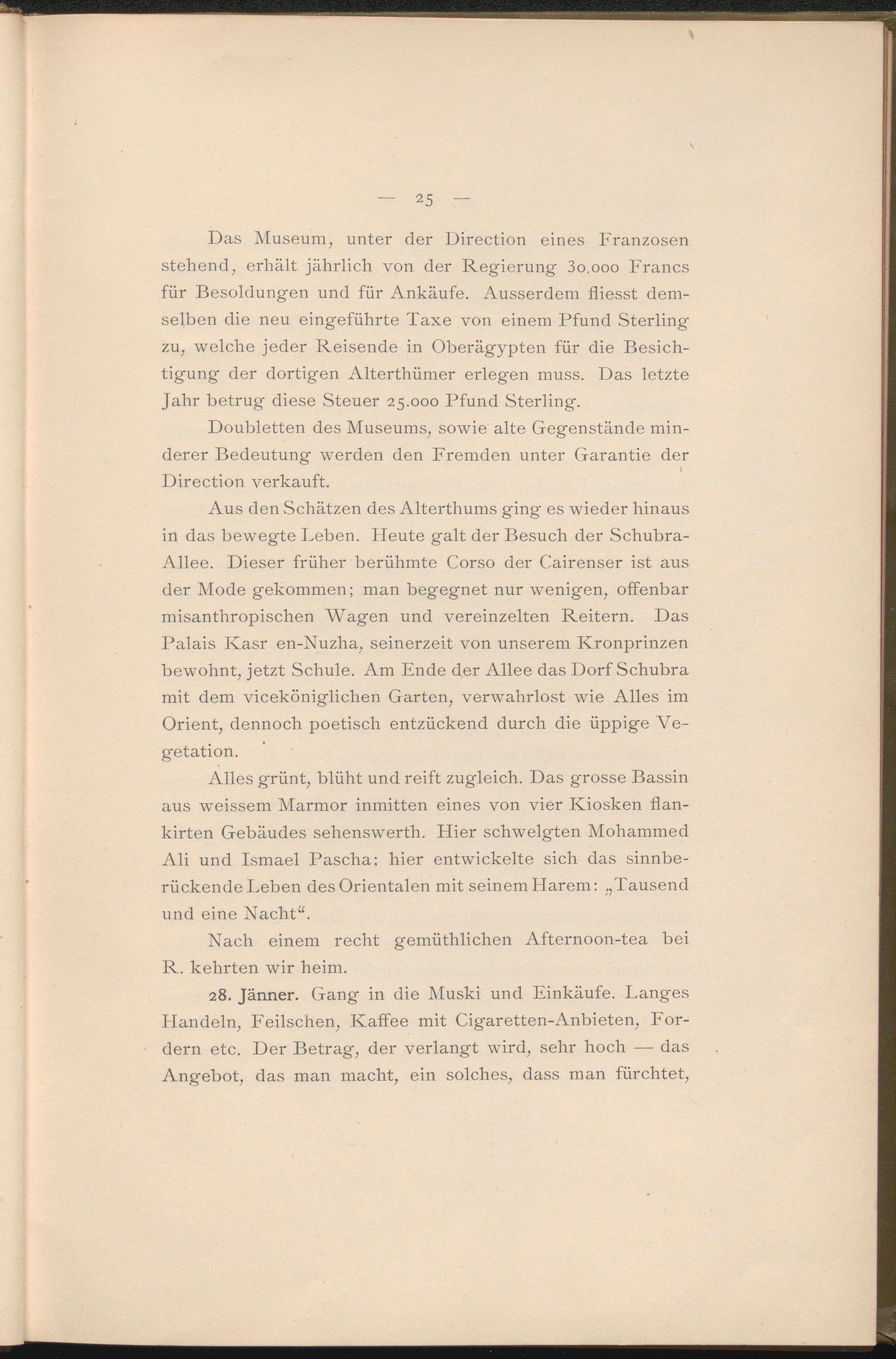 Aus den Schätzen des Alterthums ging es wieder hinaus in das bewegte Leben. Heute galt der Besuch der Schubra- Allee. Dieser früher berühmte Corso der Cairenser ist aus der Mode gekommen; man begegnet nur wenigen, offenbar misanthropischen Wagen und vereinzelten Reitern. Das Palais Kasr en-Nuzha, seinerzeit von unserem Kronprinzen bewohnt, jetzt Schule. Am Ende der Allee das Dorf Schubra mit dem viceköniglichen Garten, verwahrlost wie Alles im Orient, dennoch poetisch entzückend durch die üppige Vegetation.
