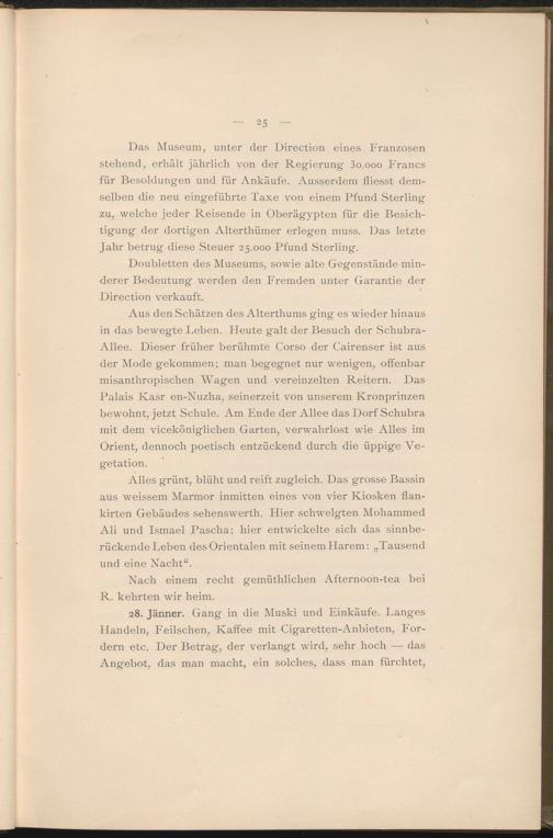 28. Jänner. Gang in die Muski und Einkäufe. Langes Handeln, Feilschen, Kaffee mit Cigaretten-Anbieten, Fordern etc. Der Betrag, der verlangt wird, sehr hoch — das Angebot, das man macht, ein solches, dass man fürchtet,